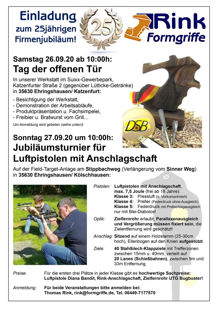 Jubiläumsturnier für Luftpistolen mit Anschlagschaft am Sonntag den 27.09.20 um 10:00h.