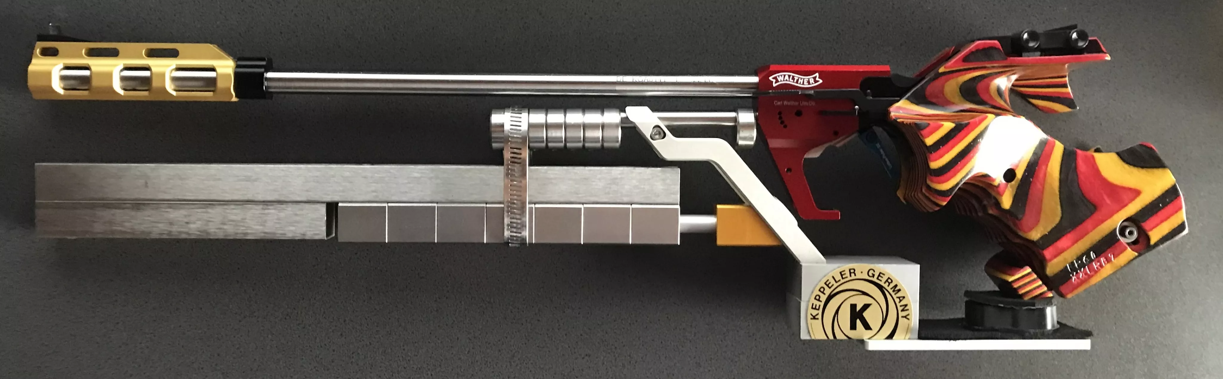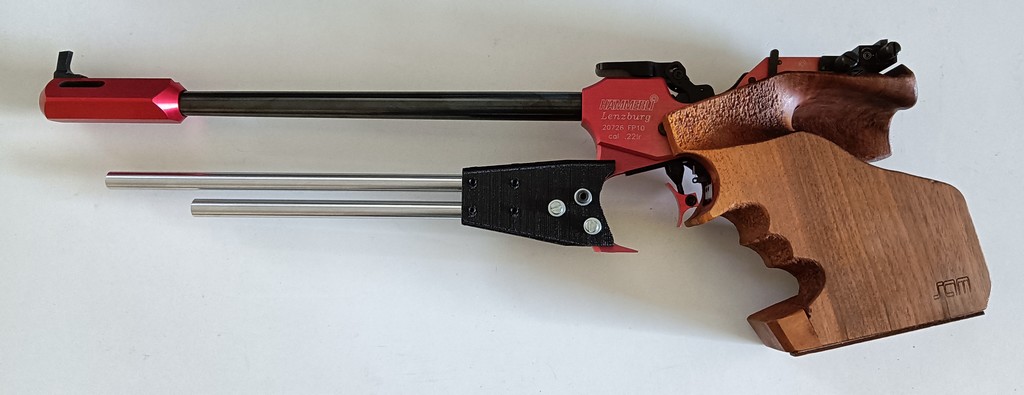 Bei meinem ersten Versuch hatte ich ja die Masse am Lauf geklemmt und das verändert wohl komplett die Karakteristik des Laufs. Die Schüsse waren in der 7 hoch und rechts. Bei der neuen Konstruktion habe ich eine Möglichkeit gesucht den Lauf völlig frei zu lassen und nun ist es so, dass die Schüsse nach dem Anbau bei der 8 bis 9 tief lagen, was ja auch logisch ist. Bei meiner Spopi hat der Anbau von Zusatzgewichten auch dazu geführt, dass nach dem Anbau die Schüsse tiefer lagen weil sie halt nicht mehr so stark springt.