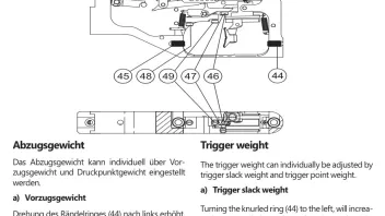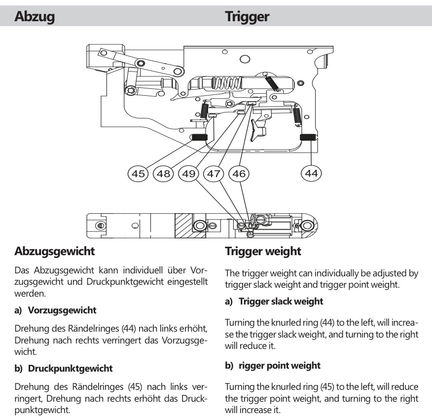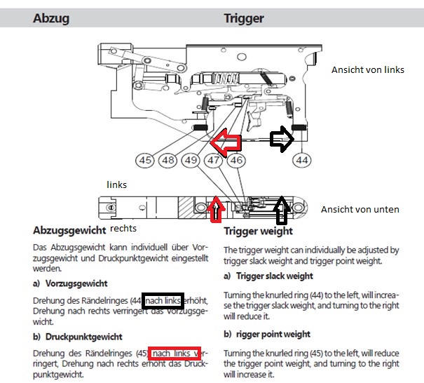 Drehung des Rändelringes (45) nach links (im Uhrzeigersinn) verringert, Drehung nach rechts (gegen Uhrzeigersinn) erhöht das Druckpunktgewichtmuss ich später mal testen….