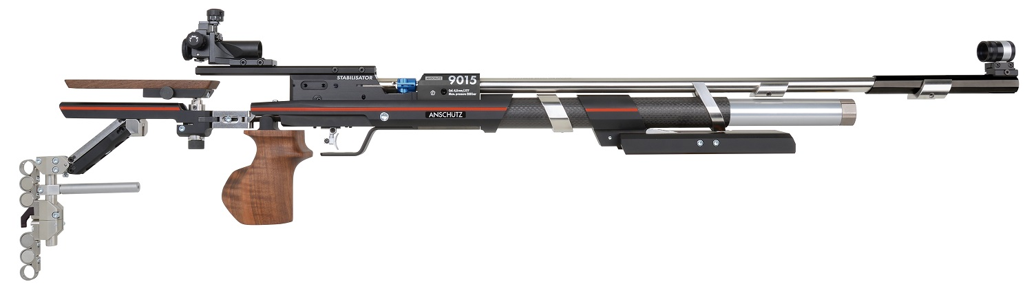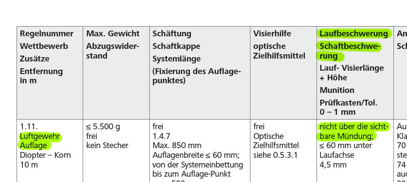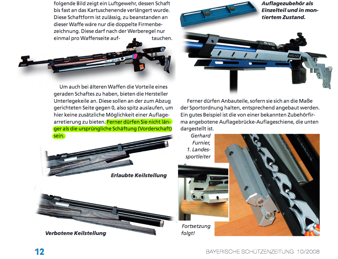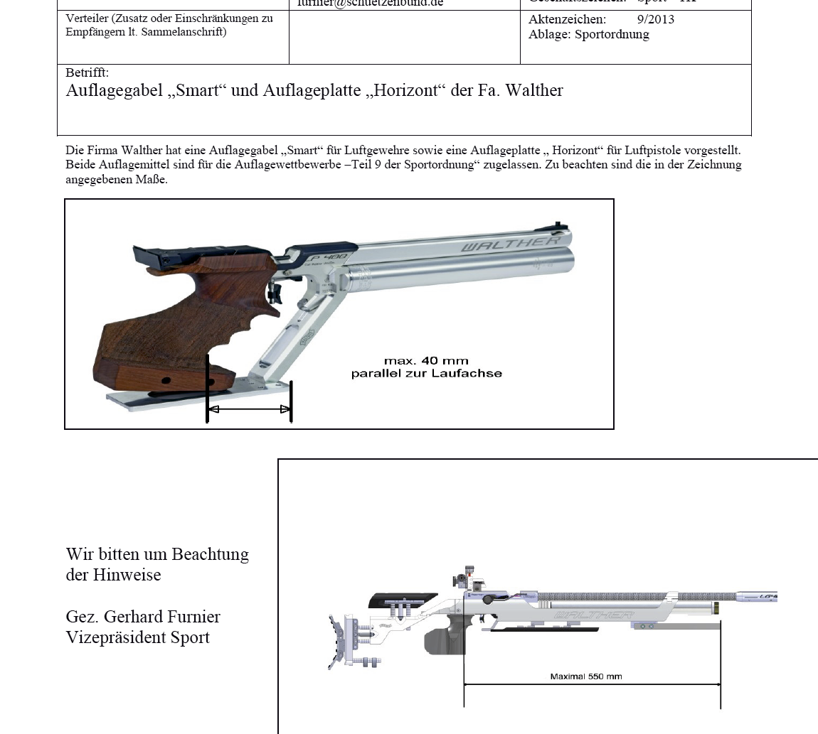 Meine Forschungen in der DSB-Sportordnung haben mir nicht weitergeholfen. Dass der Auflagepunkt max. 550mm vom Systemende entfernt sein darf und bei längerer Auflage markiert werden muss, ist bekannt – aber eine klare Aussage, dass die Auflage länger sein darf als der ursprüngliche Schaft habe ich tatsächlich nicht gefunden. Nur in den Mitteilungen der technischen Kommision Teil 14 Seite 12, fand ich die Genehmigung für eine Auflagegabel "Smart" von Walther. Diese ragt auf dem Bild deutlich über den Schaft hinaus - aber die Regelkonformität bezieht sich ja nur auf dieses eine Produkt.