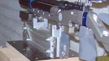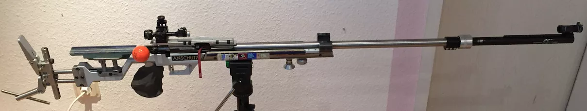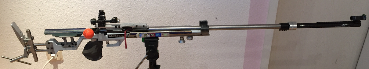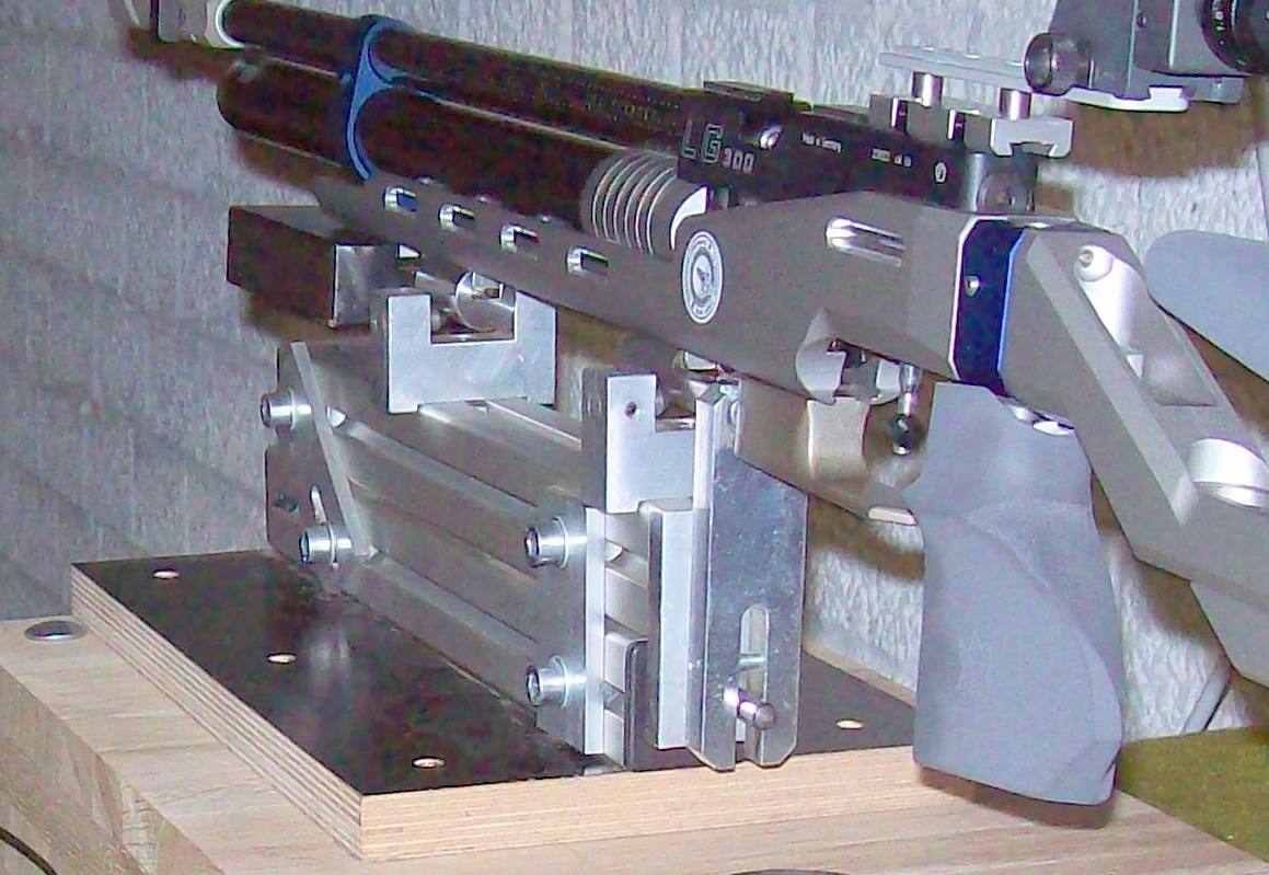 Das Gewehr wird in der T-Schiene auf einen soliden Alu-Klotz befestigt und dieser dann mit der Klemmung ausgerichtet und befestigt.