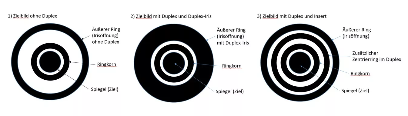 3) Mit einem Insert bleibt die Diopteröffnung wie ohne Dupplex, aber als Zentrierhilfe wird ein weiterer Ring zwischen Diopteröffnung und Ringkorn platziert.