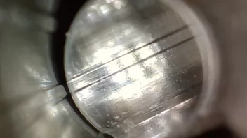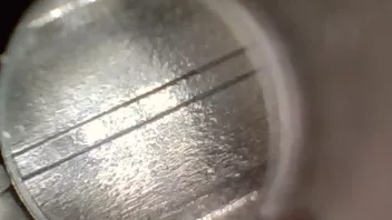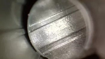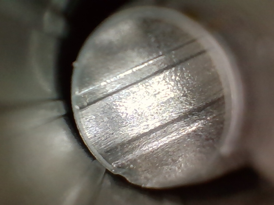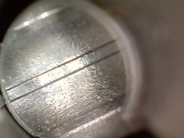 Dazwischen ist der Belag (mittlerweile glaub ich auch, dass das Blei ist) unterschiedlich stark, am stärksten in der Mitte des Laufs. Das ist aber schwer zu quantifizieren. Eindeutig ist aber, dass der untere Bereich es Laufs erheblich stärker betroffen ist als die obere Seite. Ganz oben (So im Bereich von 10:00 - 2:00 ist nur sehr wenig bis gar nichts.