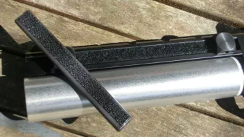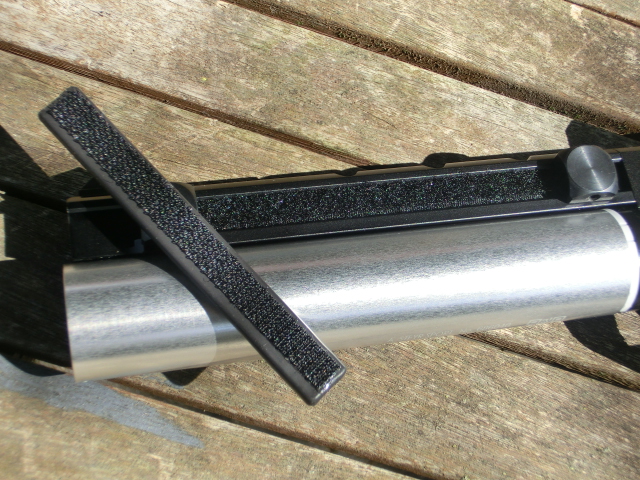 hatte noch etwas bandstahl (12 x 5 mm) rumliegen, aus denen ich 2 stangen, ca. 100 mm lang, gemacht habe. als nächstes schwarzer schrumpfschlauch drüber und dann befestigung mittels klettverschluss an beiden seiten des laufmantels. also immer wieder entfernbar.