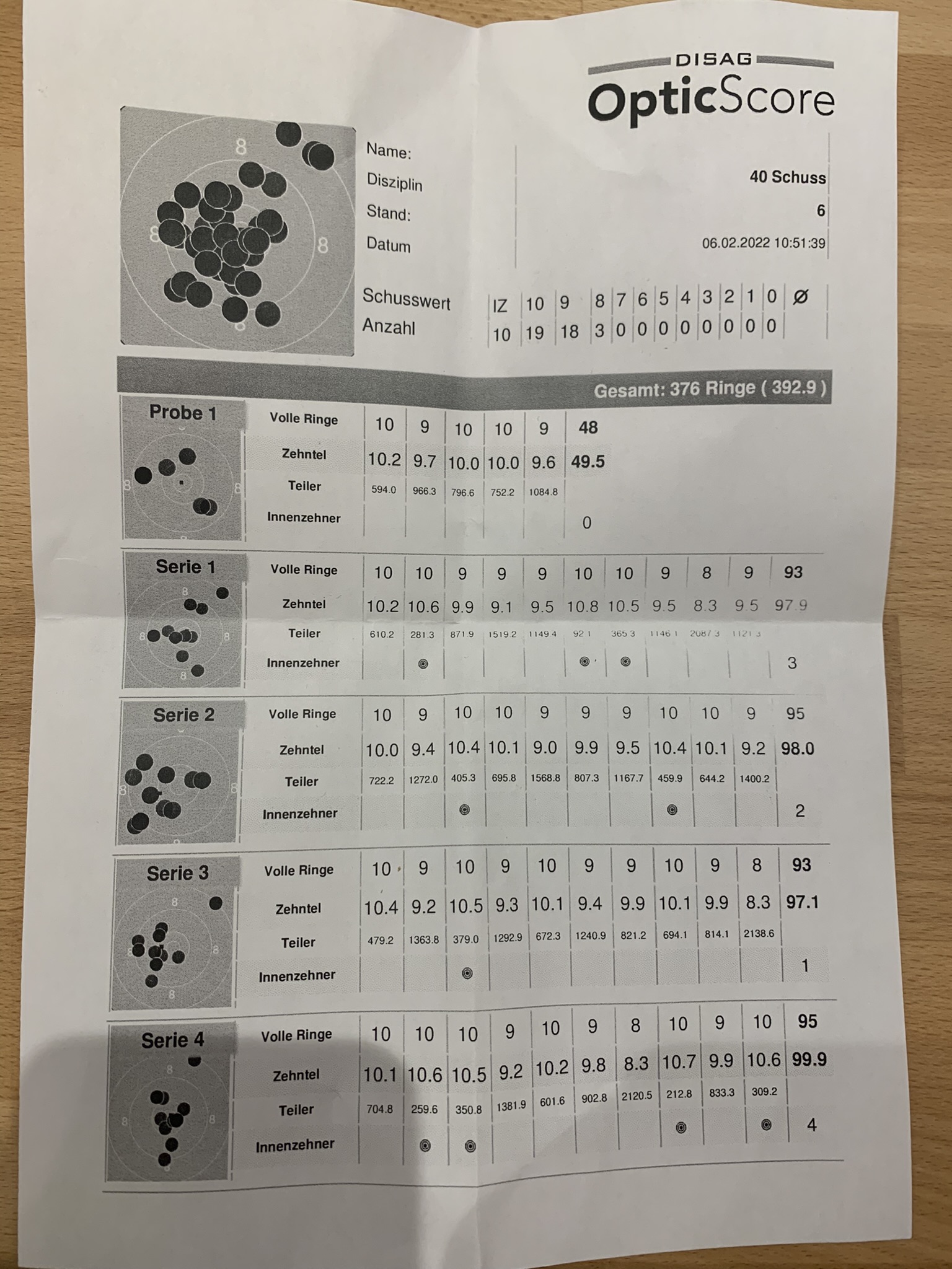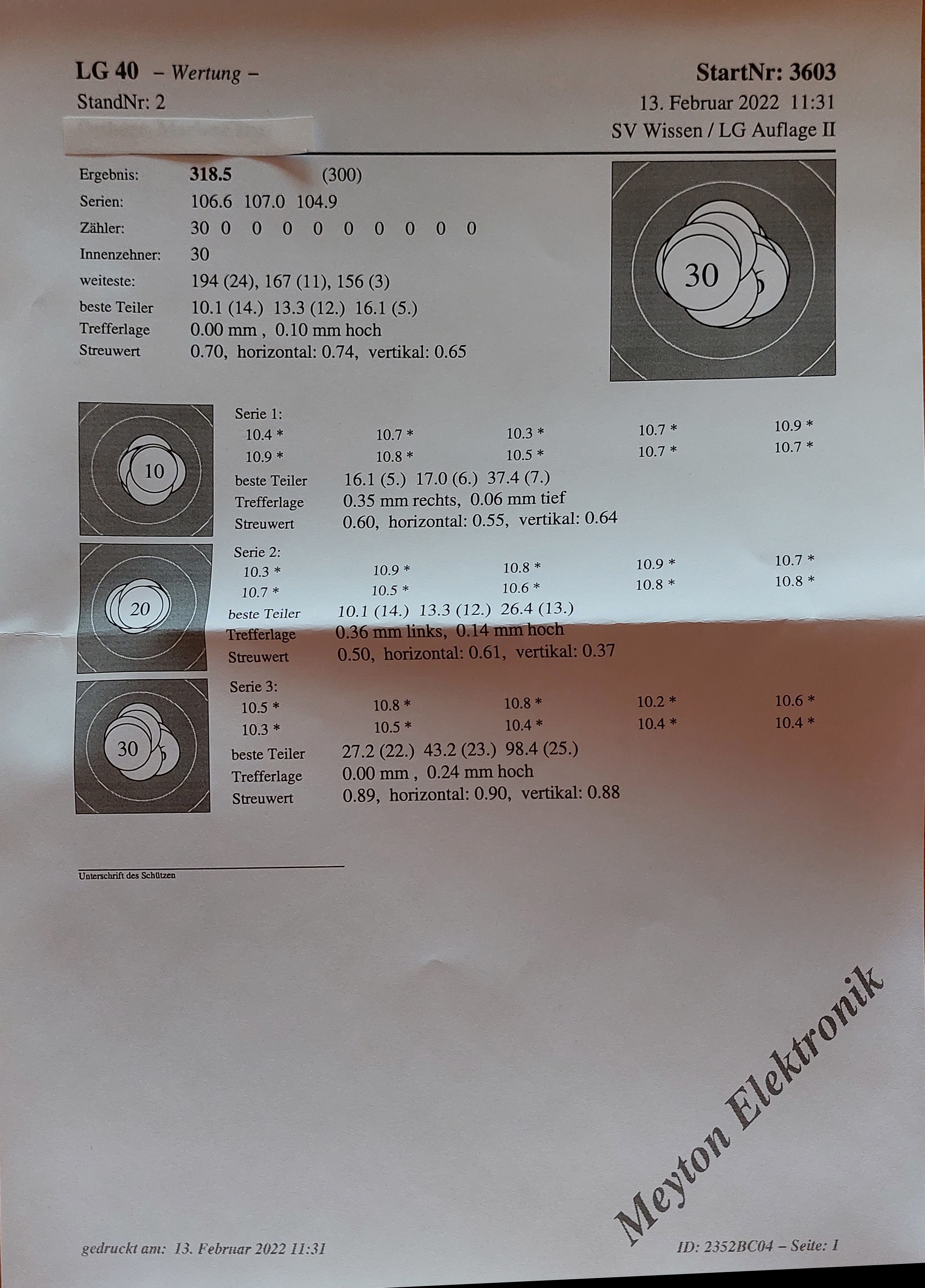 LP Aufl. 100,4, 100,0, 102,2 = 302,6 BM Ergebnis und erstes geschossenes Ergebnis. Macht Laune!