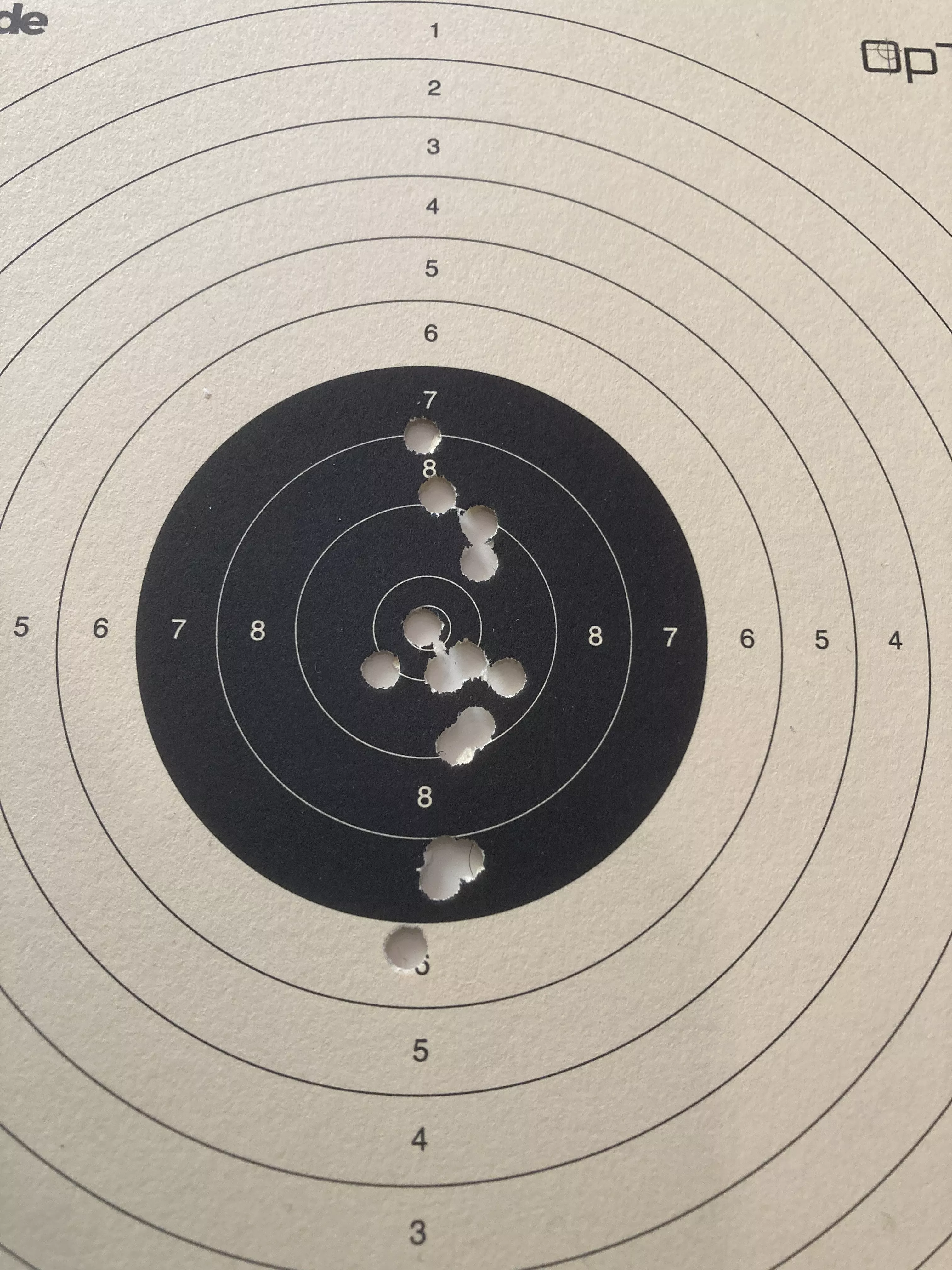 Wir hatten das schon mal, so ein Schussbild hat eher nix mit Schwanken zu tun. Das hat mit Wahrnehmung zu tun. Bei Schwankungen ist die Streuung eher in alle Richtungen gleich. Wenn jemand in der Breite die 10 halten kann, hat das andere Ursachen. Entweder wandert das Auge, oder ist der Halteraum nicht optimal, es kann auch sein das die Lichthöfe nicht optimal sind..............