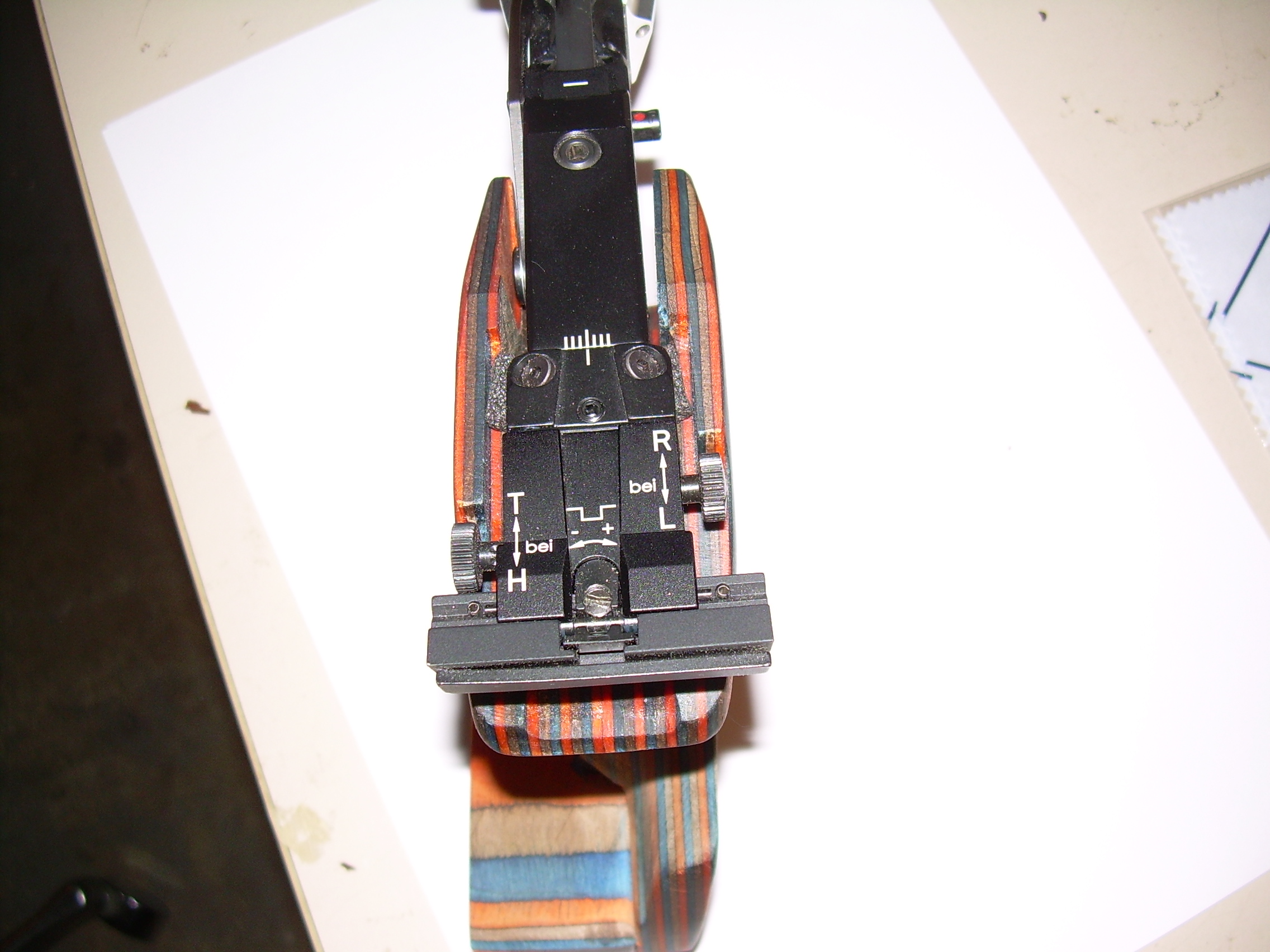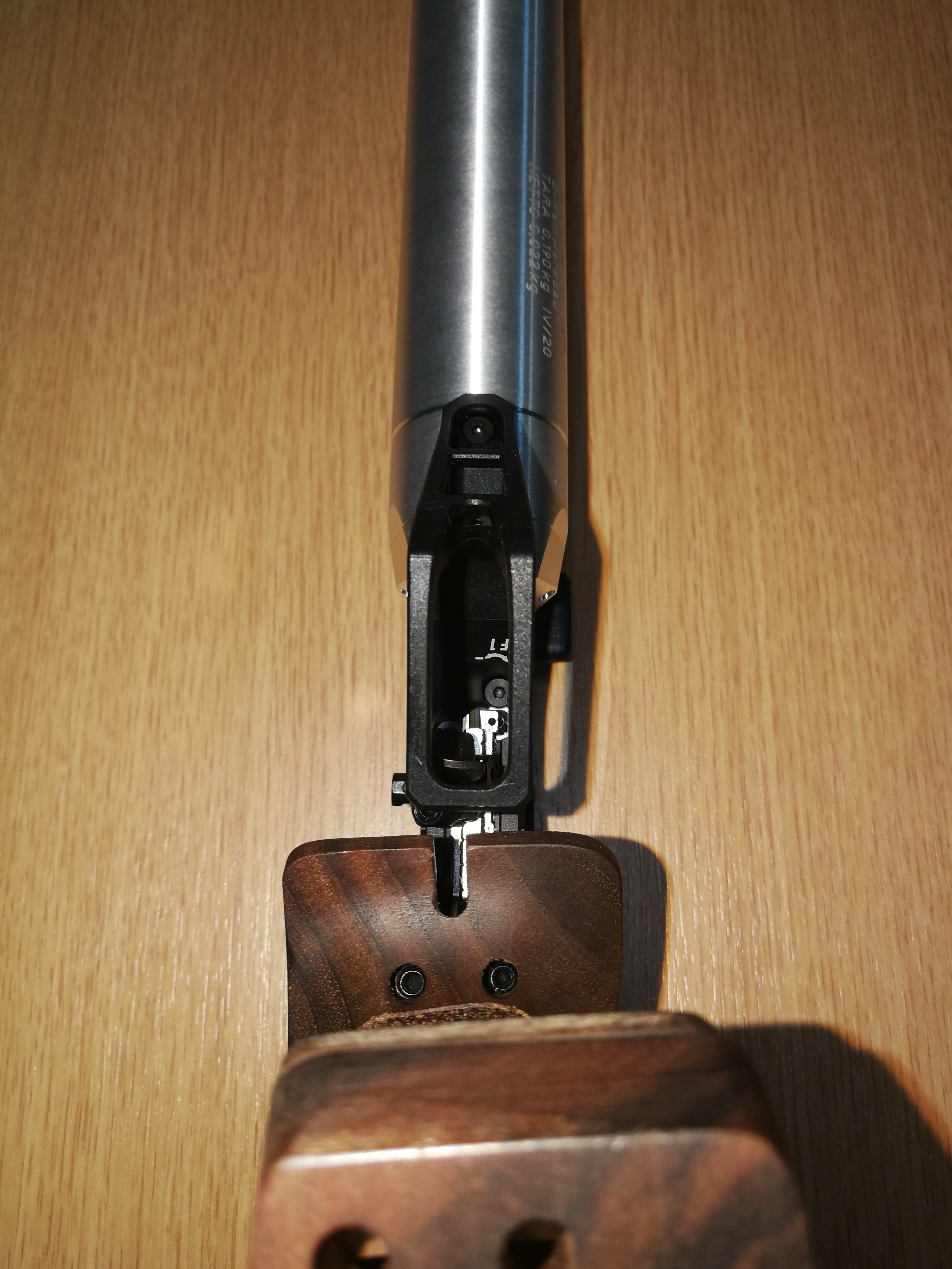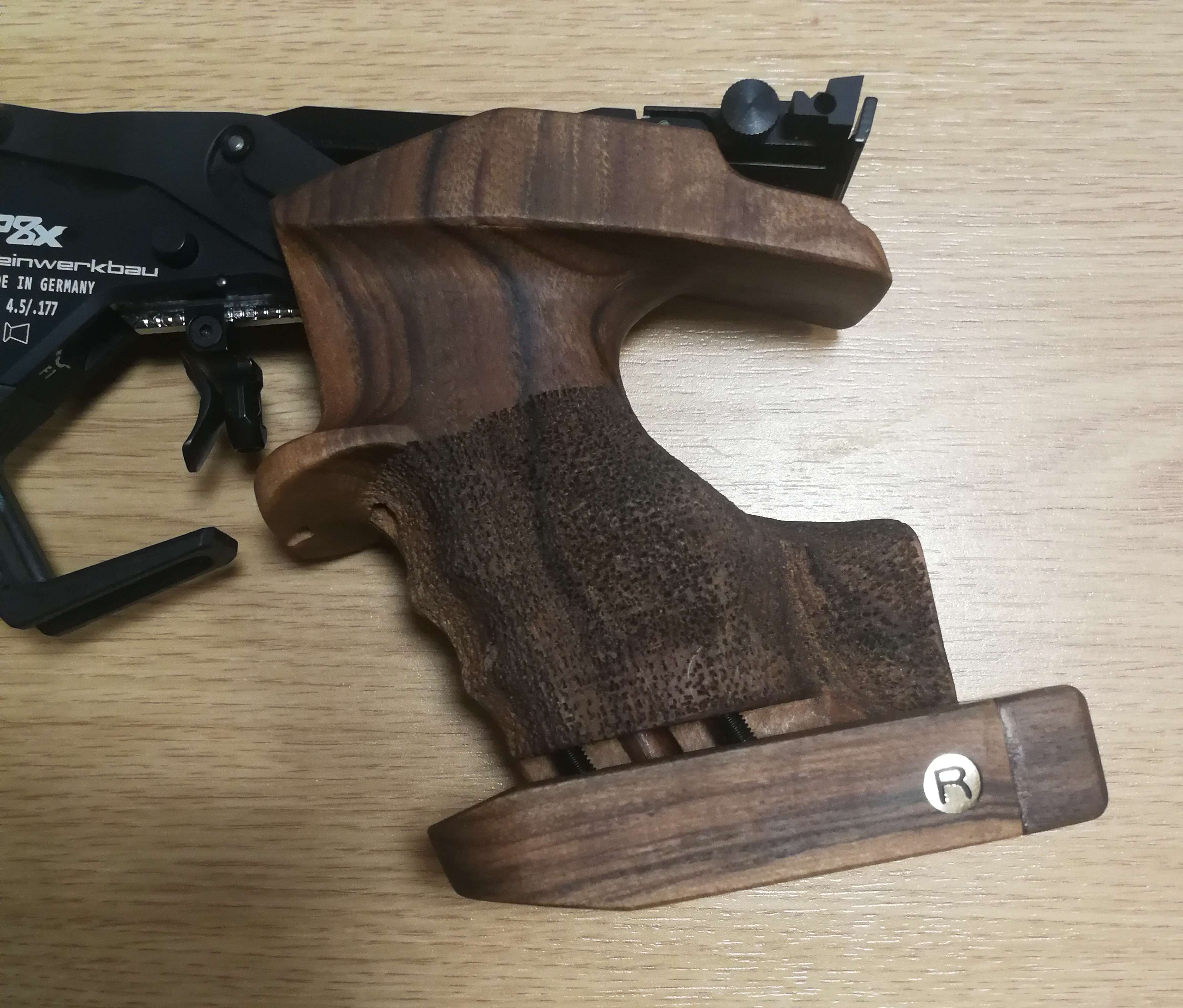 1. Der Griff ist eigentlich zu groß. Ich habe eine Handbreite von 84 mm, mein Griff hat Größe M. Da der Verstellbereich der Handkantenauflage nicht ausreicht, habe ich diese mit einem Nussbaumbrettchen aufgedoppelt. Die Handkantenauflage passt jetzt zwar, dafür passen die Fingermulden am Griff nicht mehr so wirklich (insb. am Kleinfinger).