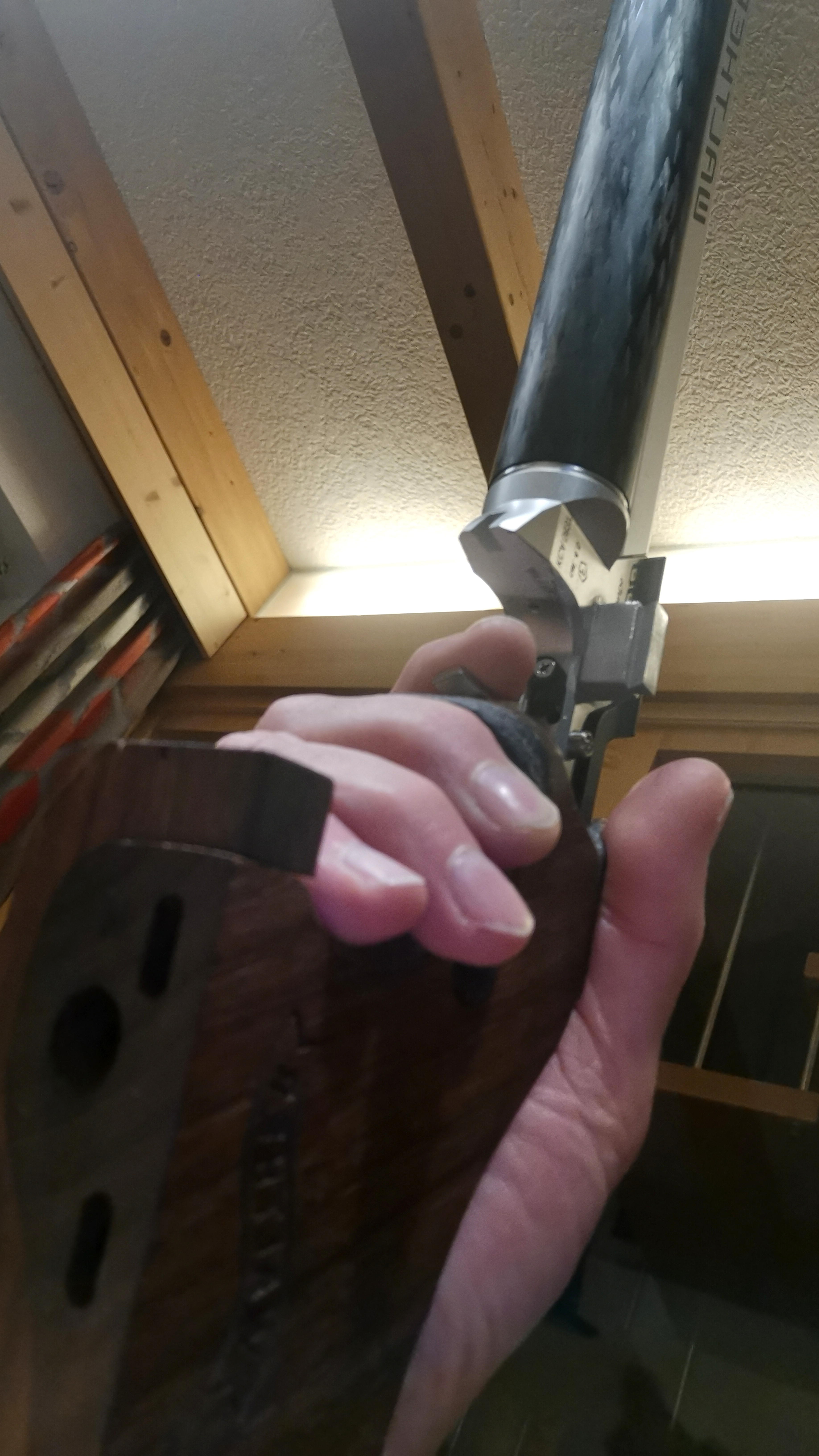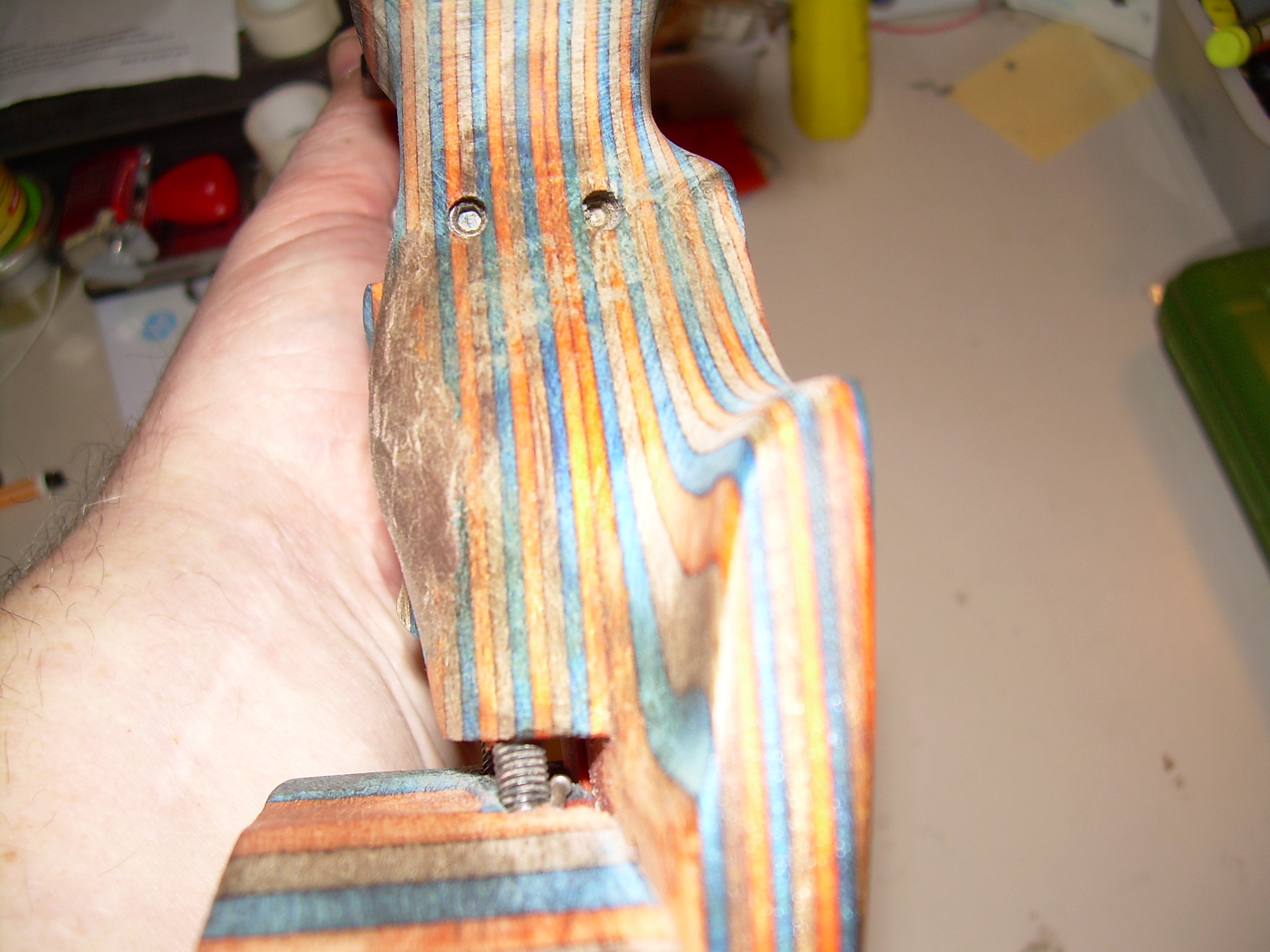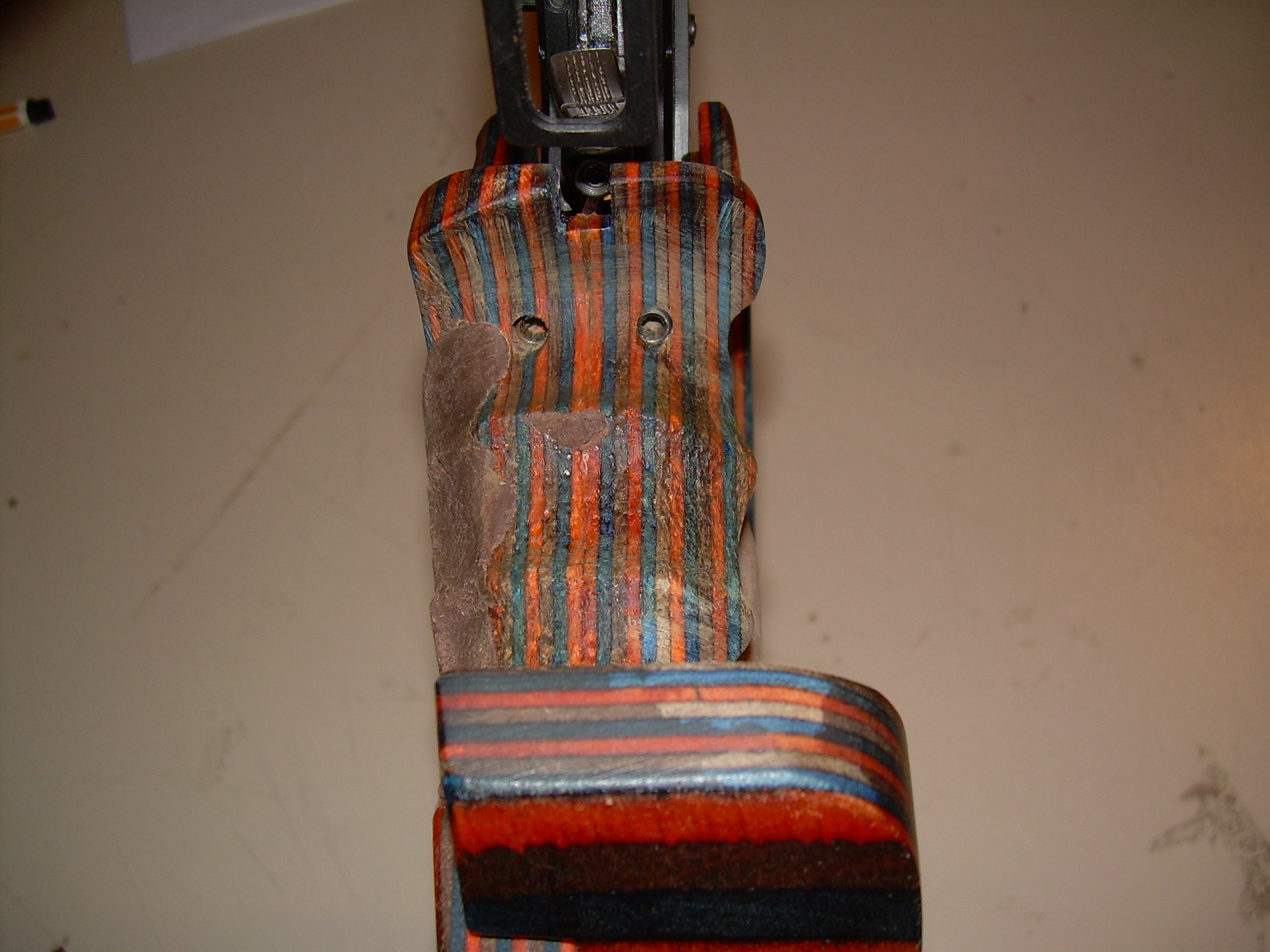 1. Der Griff ist eigentlich zu groß. Ich habe eine Handbreite von 84 mm, mein Griff hat Größe M. Da der Verstellbereich der Handkantenauflage nicht ausreicht, habe ich diese mit einem Nussbaumbrettchen aufgedoppelt. Die Handkantenauflage passt jetzt zwar, dafür passen die Fingermulden am Griff nicht mehr so wirklich (insb. am Kleinfinger).