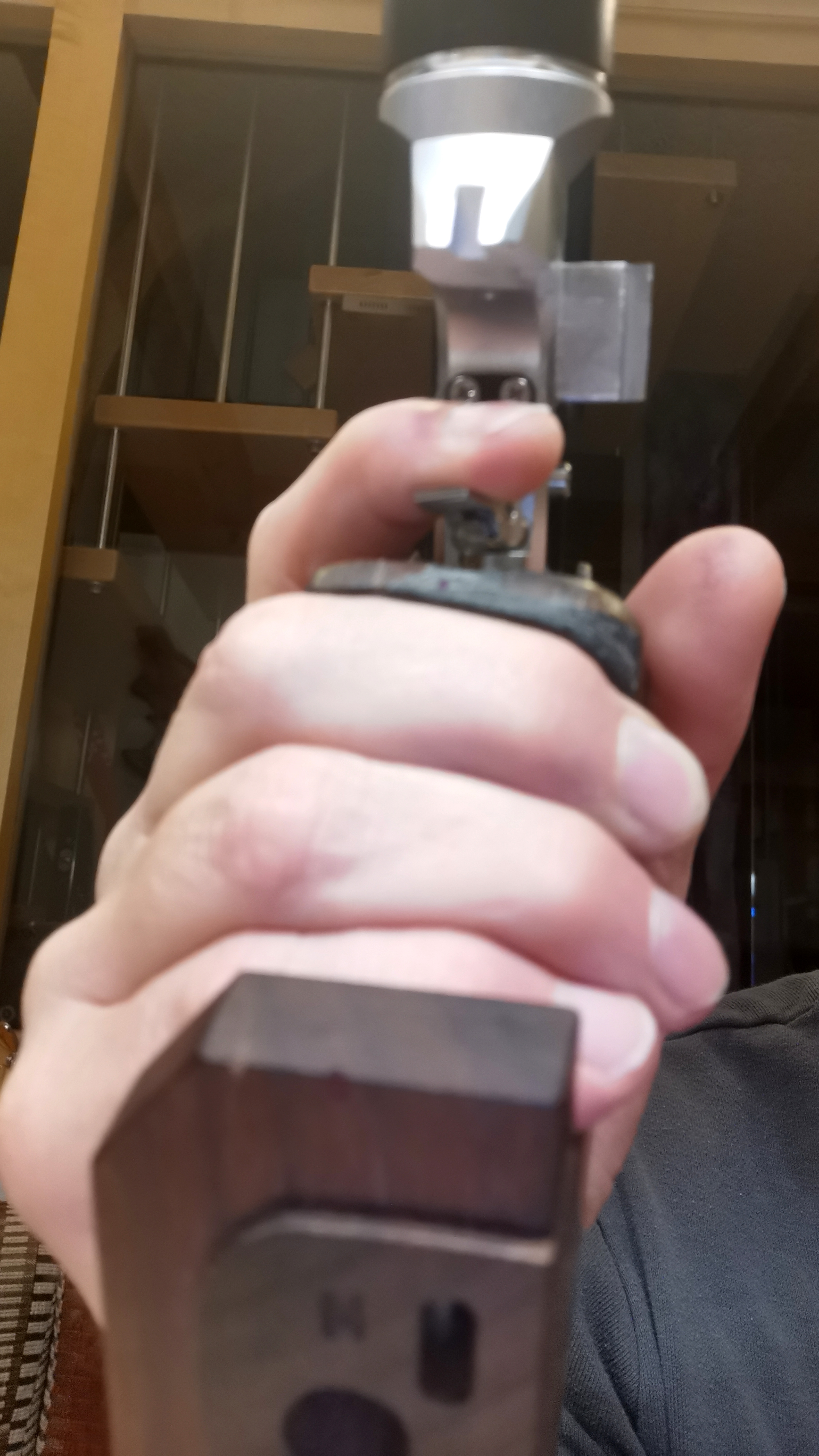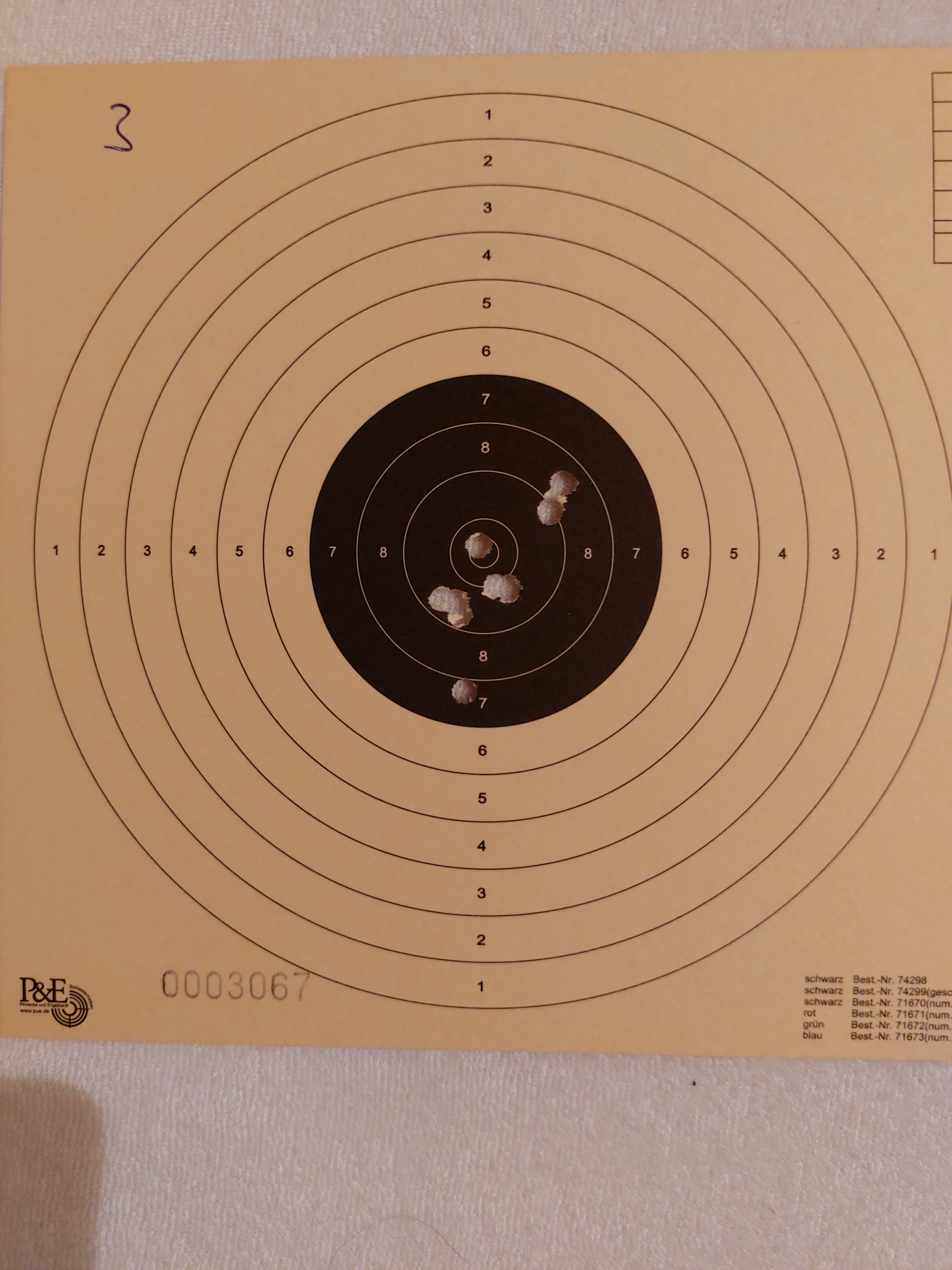 2. Als ich die neue P8X (mit neutral eingestelltem Griff) erhalten hatte, habe ich zuerst Blindanschläge gemacht, um zu sehen, wo die Visierung steht. Dabei zeigte sich, dass das Korn deutlich rechts neben der Kimme steht (als Linksschütze). Um dies auszugleichen, habe ich dann das System im Griff nach links geschwenkt. Das hat allerdings immer noch nicht genügt, um das Korn ohne aktives Gegenhalten in die Kimme zu bringen. Ich habe daher provisorisch an der Handballenauflage punktuell Material aufgefüttert. Wobei mir Verdrehung des Griffs UND zusätzliche Auffütterung schon irgendwie übertrieben vorkommen.