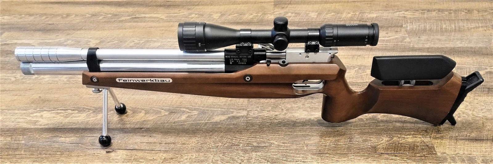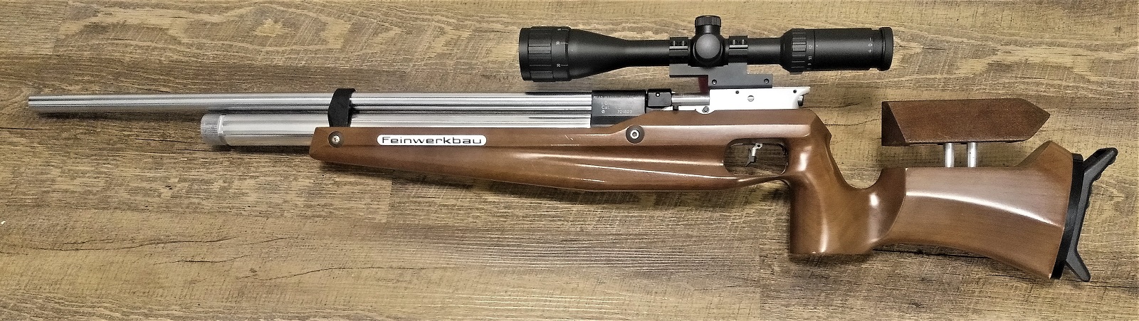 Da ich die FWB für Hunter Field Target nutzen möchte, habe ich das Gewehr noch etwas überarbeitet, einen anderen Lauf montiert, wo der Laufmantel schon gekürzt worden ist, wie bei der FWB 800 eine Prismenschiene in den vorderen Systemblock, vor dem Ladetor eingefräst und die Schaftbacke neu lackiert.