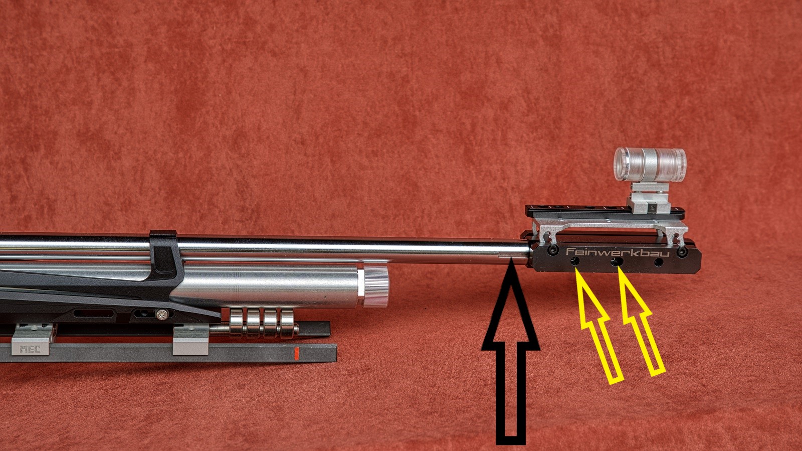 glaub es wissen nur wenige, dass man bei einigen FWB-Modellen die Tube (Laufhülse) durch lösen der beiden Schrauben (gelbe Pfeile) nach vorne schieben kann. Es wird dann die Nut im Lauf sichtbar. (schwarzer Pfeil)