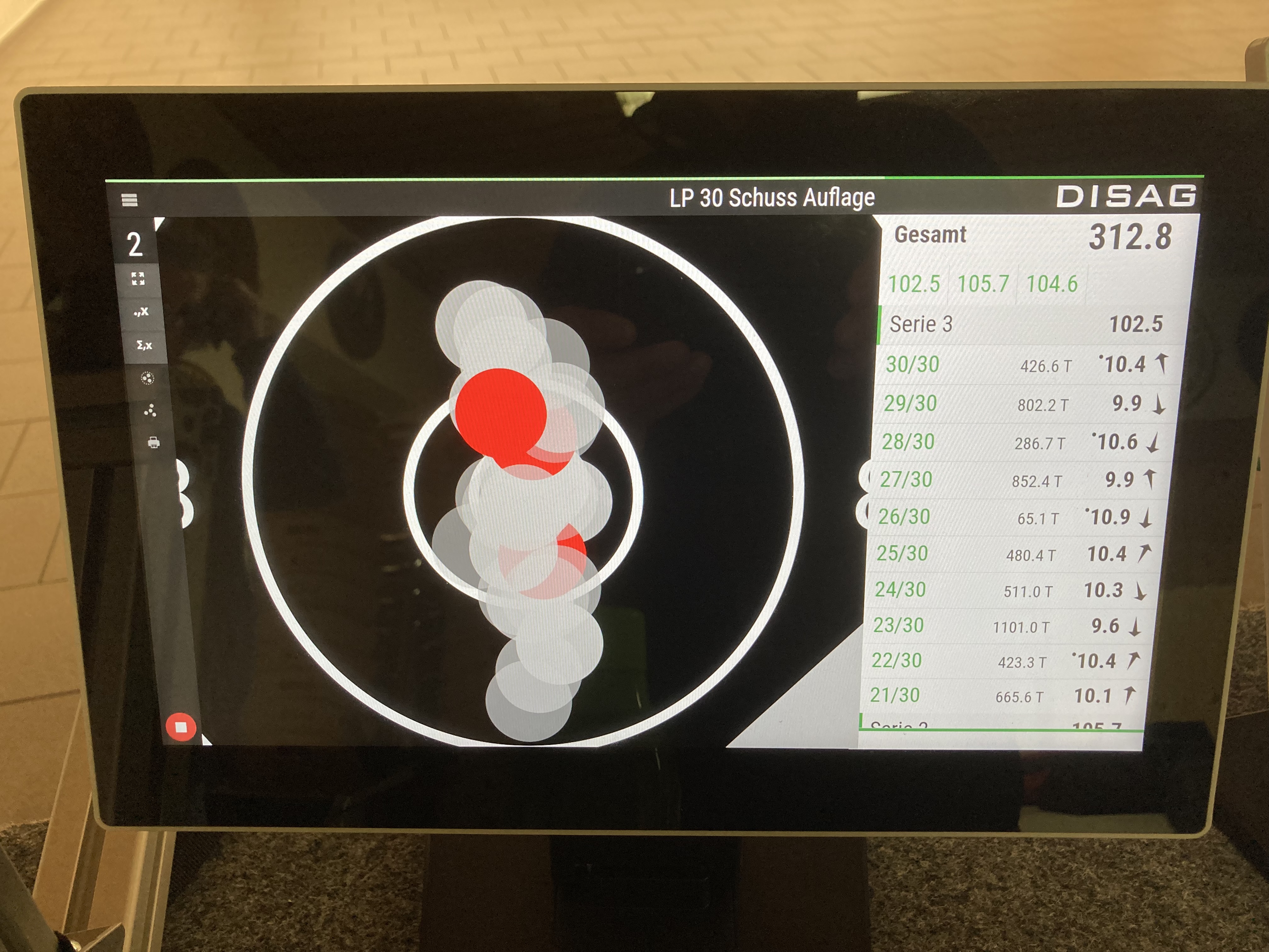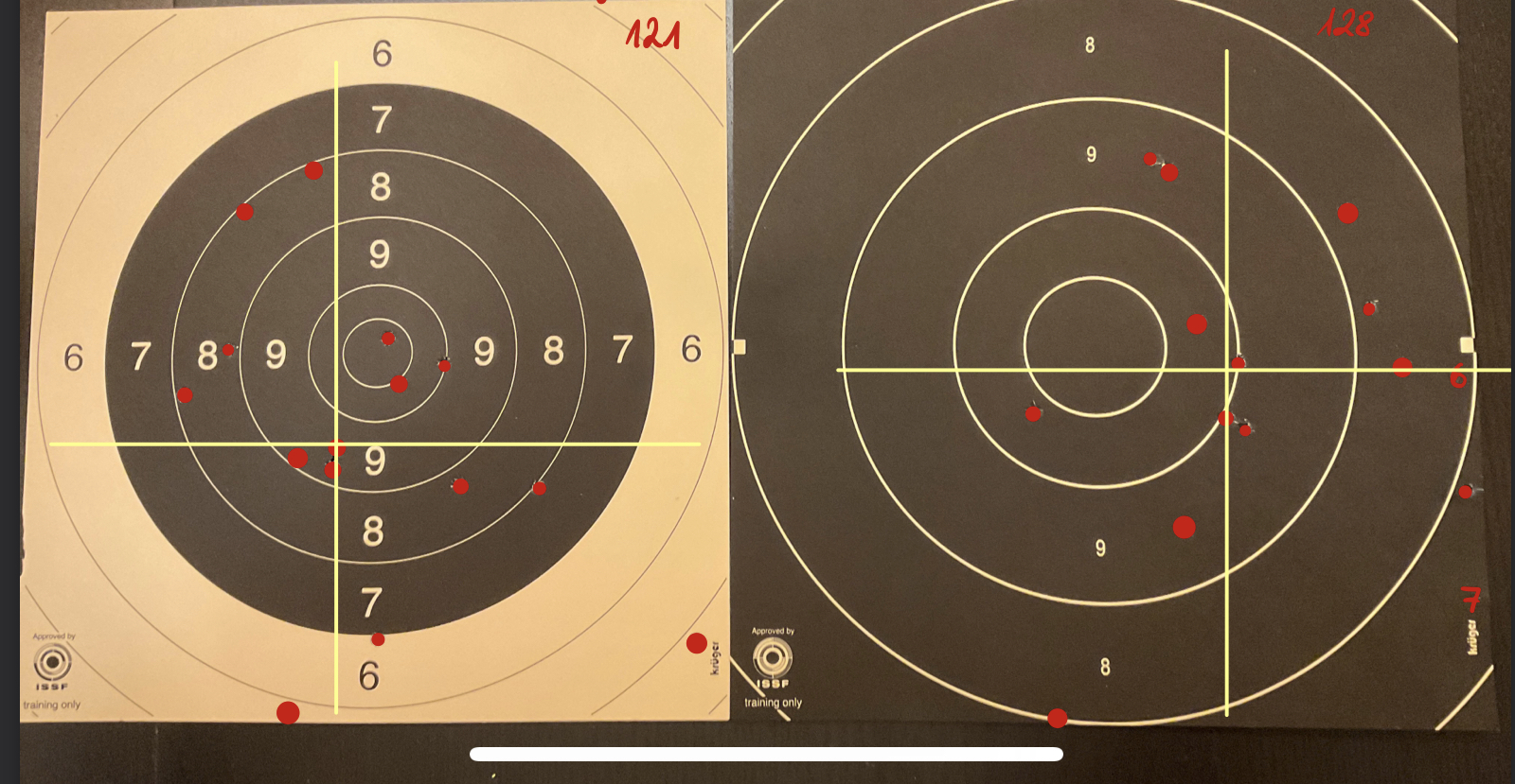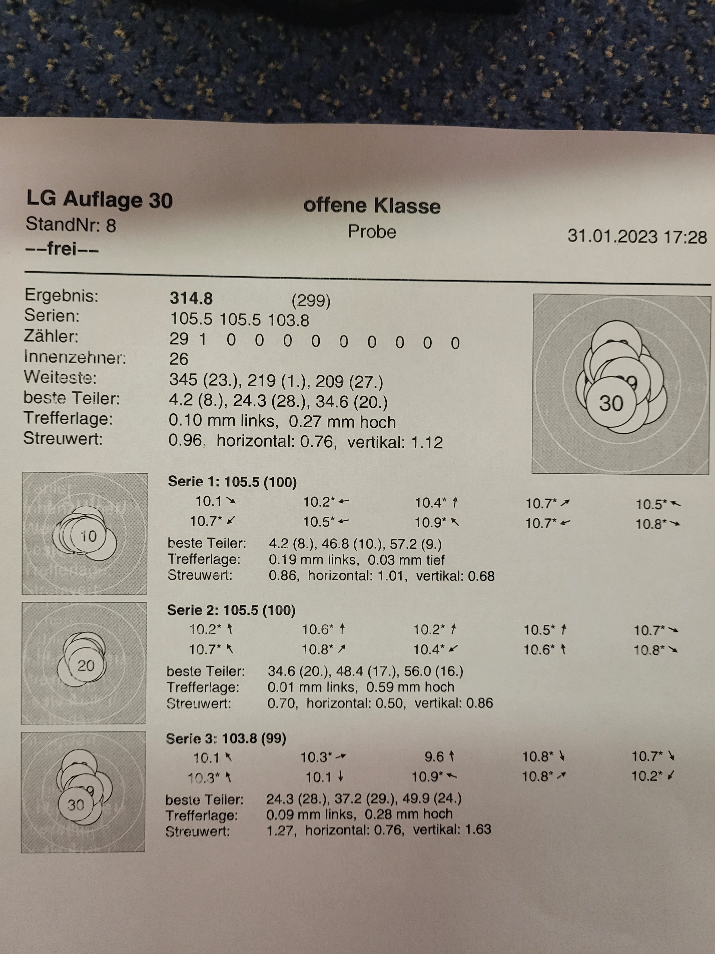 Dieses Jahr ist die Luftpistole dazugekommen. Nach ein bisschen Training ist das meine erste geschossene Serie.