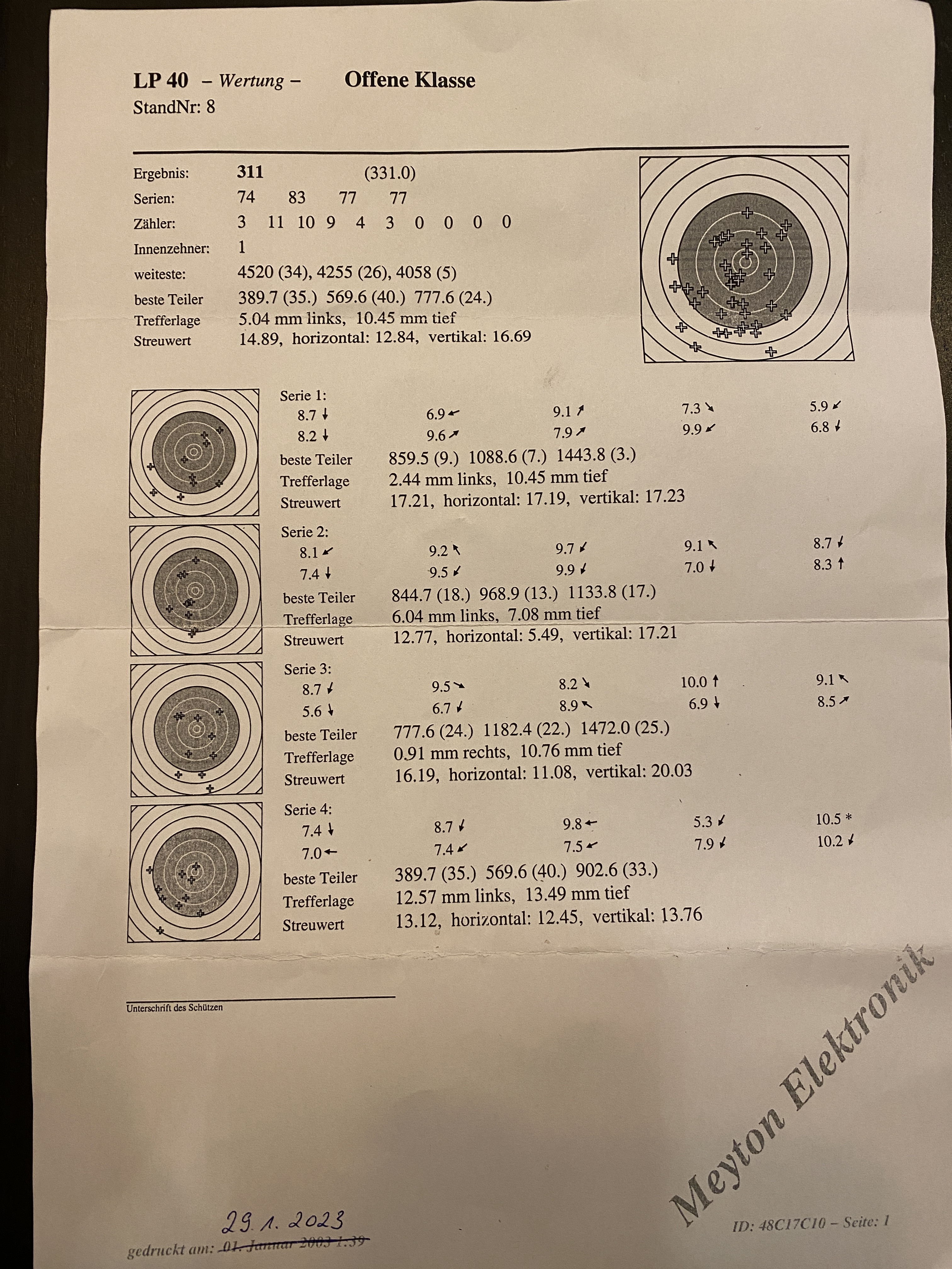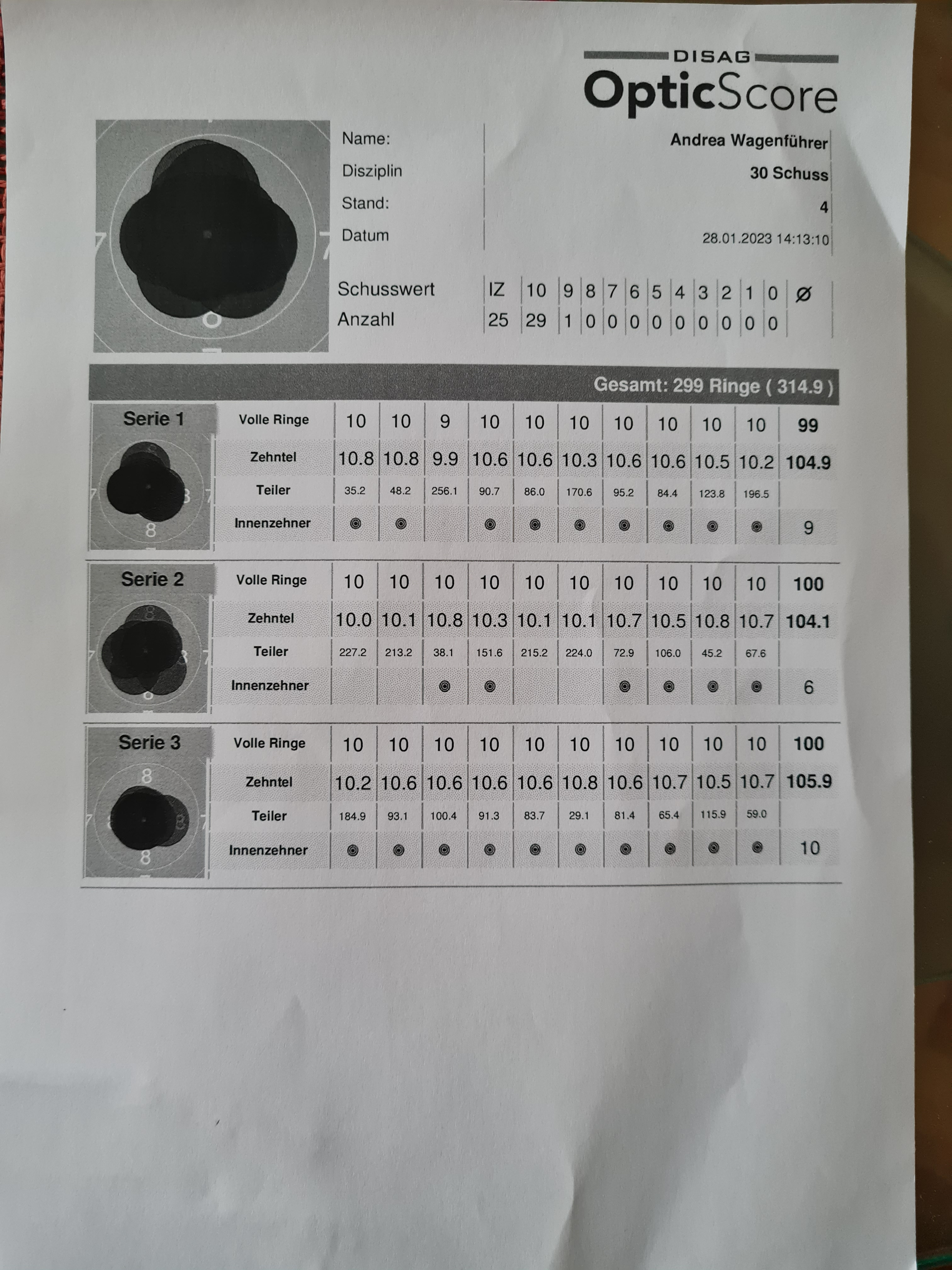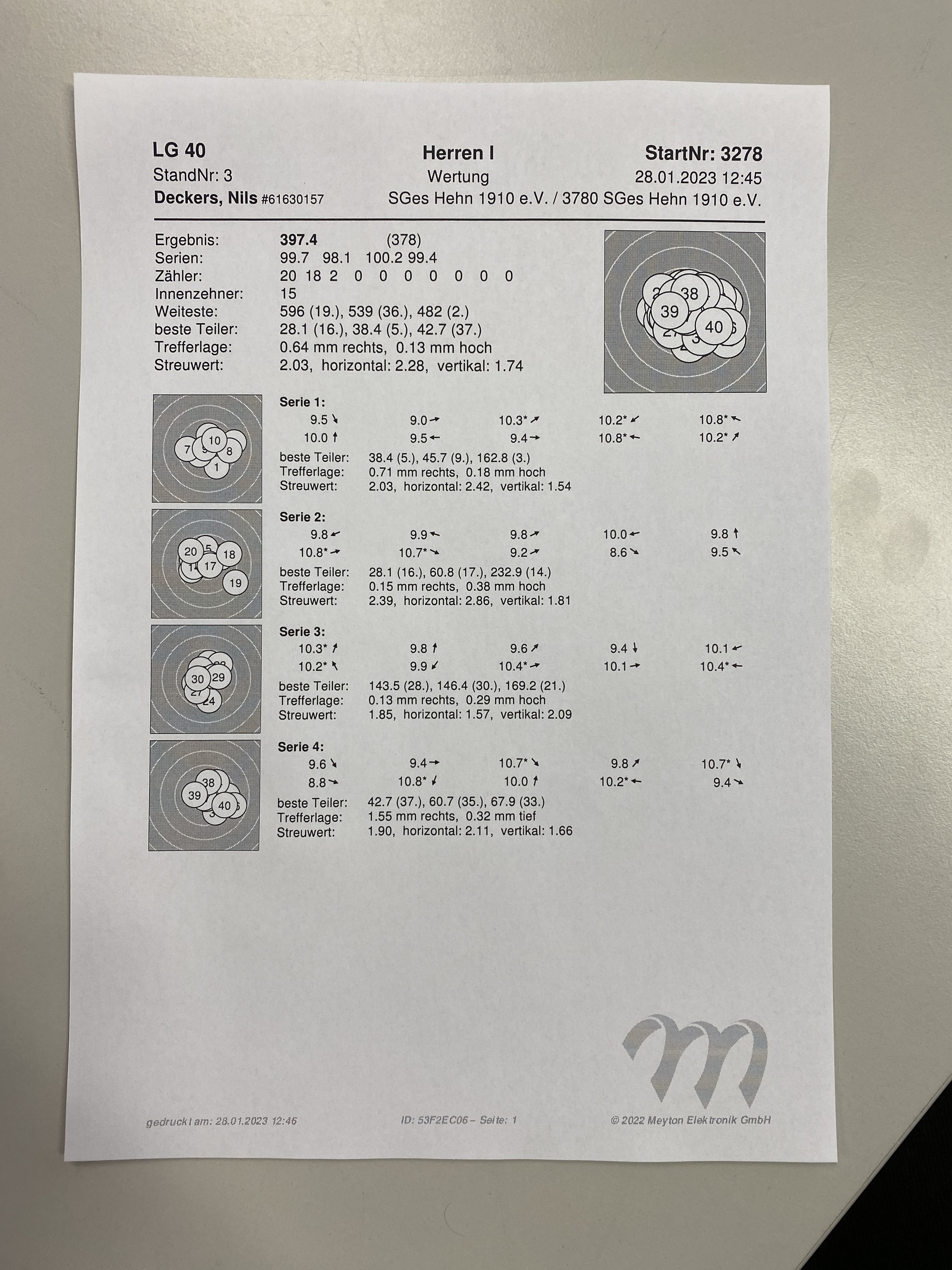 Ich betreibe den Sport erst seit Juli 2022 und da hauptsächlich Sportpistole KK. Das war jetzt auch mein bestes Ergebnis und das gleich am 02.01.2023. Ich hoffe ich kann das noch steigern.