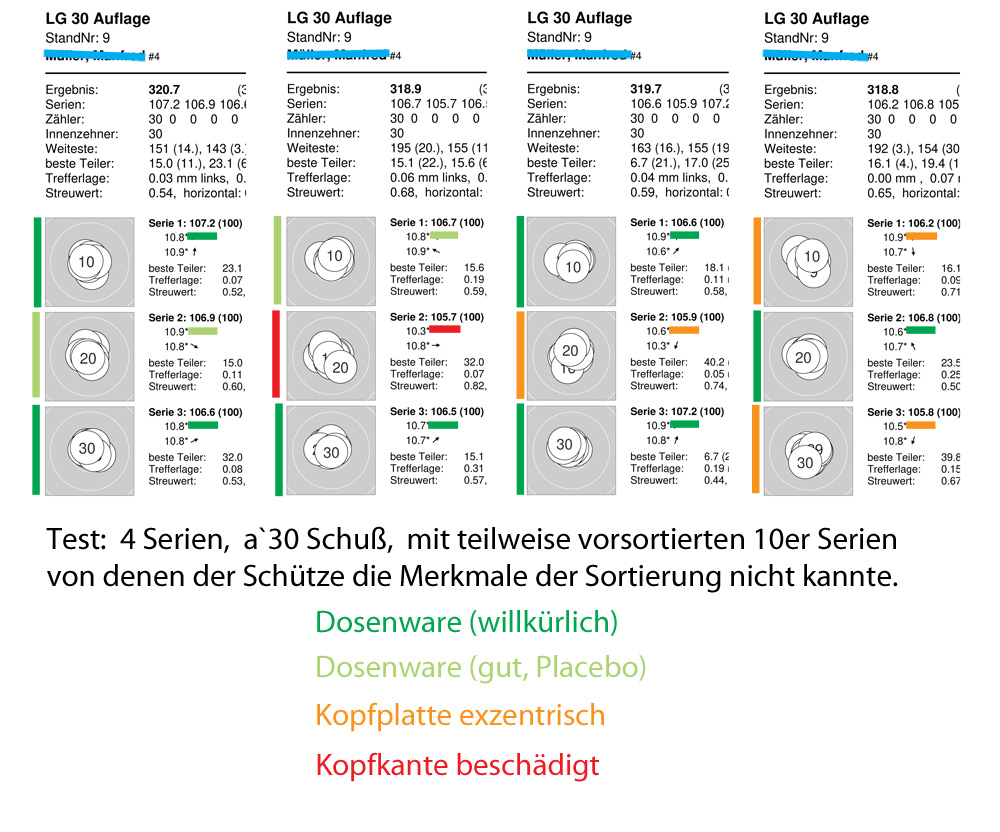 Wissend dass er getestete Munition verwendet, bat ich ihn um eine frische Dose um sie zu inspizieren. Etwas später gab ich ihm die Diabolos in Reihen gegliedert in zwei Schüttelboxen zurück. Nicht wissend welche Reihe welches Merkmal aufwies, schoss er mir vier Trainigsserien a`30 Schuss.