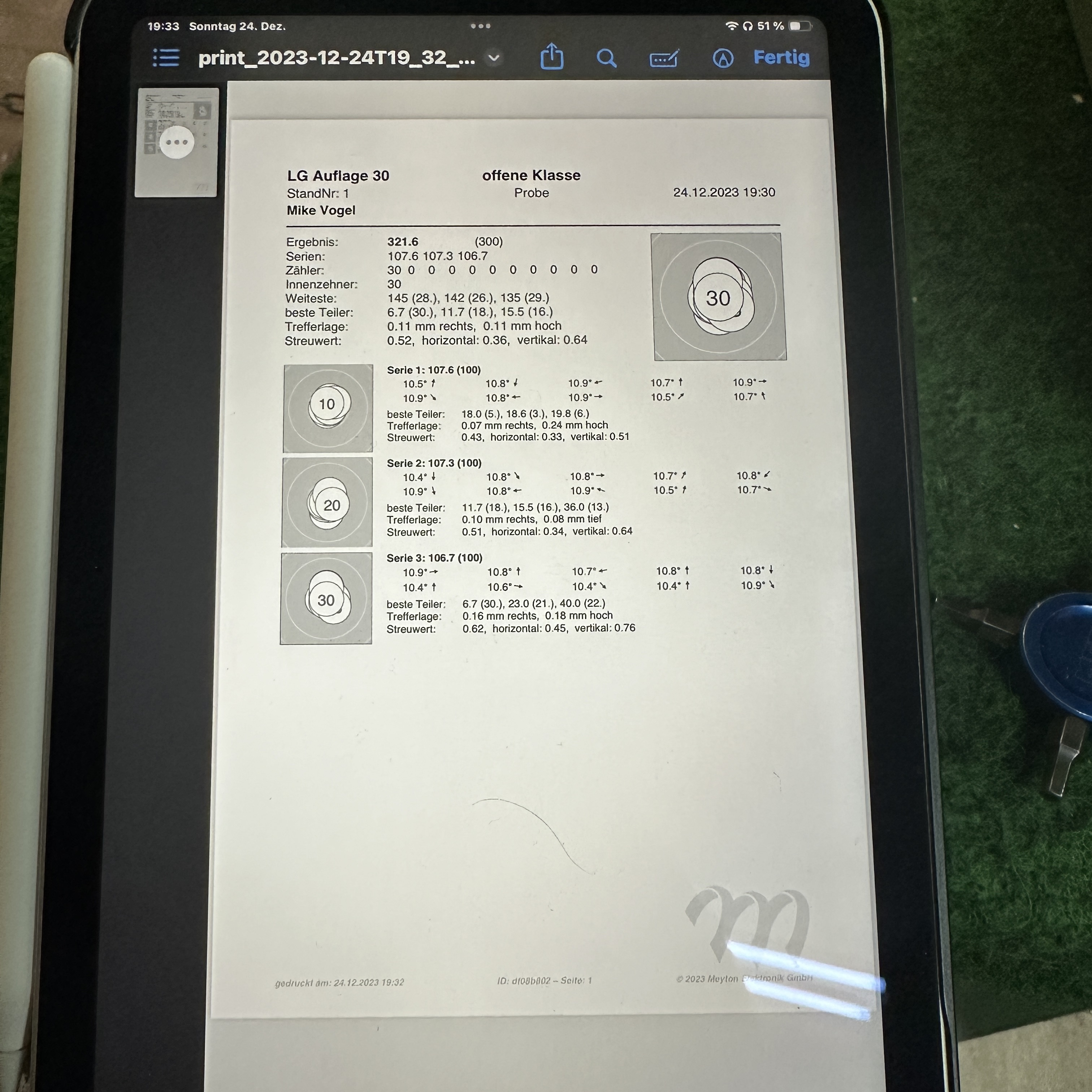 Es wird alles sehr heiß gekocht. Z.Zt schieße ich noch meine Chinamunition vom monotec E. Und isch schieße sie auch im Wettkampf (gestern noch in der Rheinlandliga 2 x 300) wobei im Moment die Zehntel nicht interessieren und bei der Kreismeisterschaft war es ir auch egal. Lange Rede gar kein Sinn, als ich letzte Woche bei MC zum Test war, habe ich sie da auf meinem ITEC E probiert und siehe da, sie hat 6,78 Dmax. So etwas würde ich nie kaufen und trotzdem habe ich an Heilig Abend damit 321,6 geschossen.