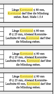 Dafür findet sich dort unter 1.5.4 die Änderung, wonach der Korntunnel jetzt max. 80 mm über dem Lauf stehen darf. Dort steht übrigens 'Radiale Höhe des Kronzentrums'. Kann passieren, sollte so aber nicht in so einer Korrektur und und damit ja auch Arbeitsanweisung stehen, die doch hoffentlich vorher auch mal auf Fehler hin überprüft wird, oder.