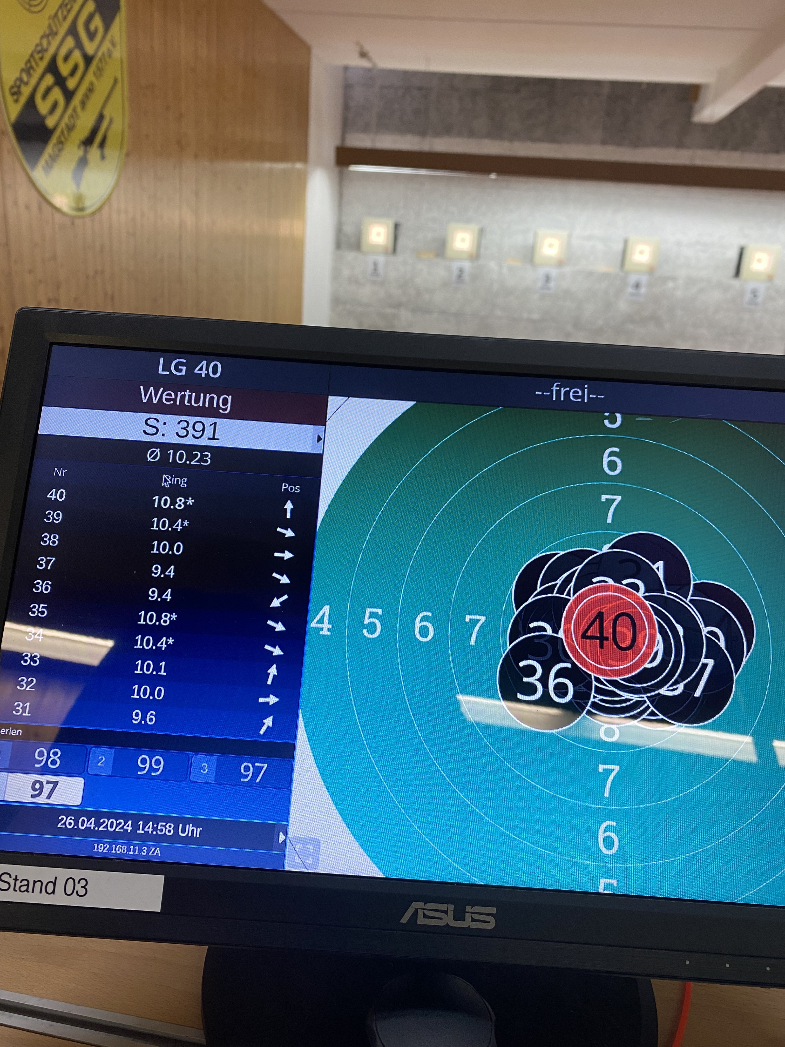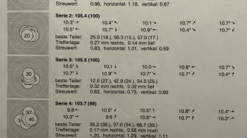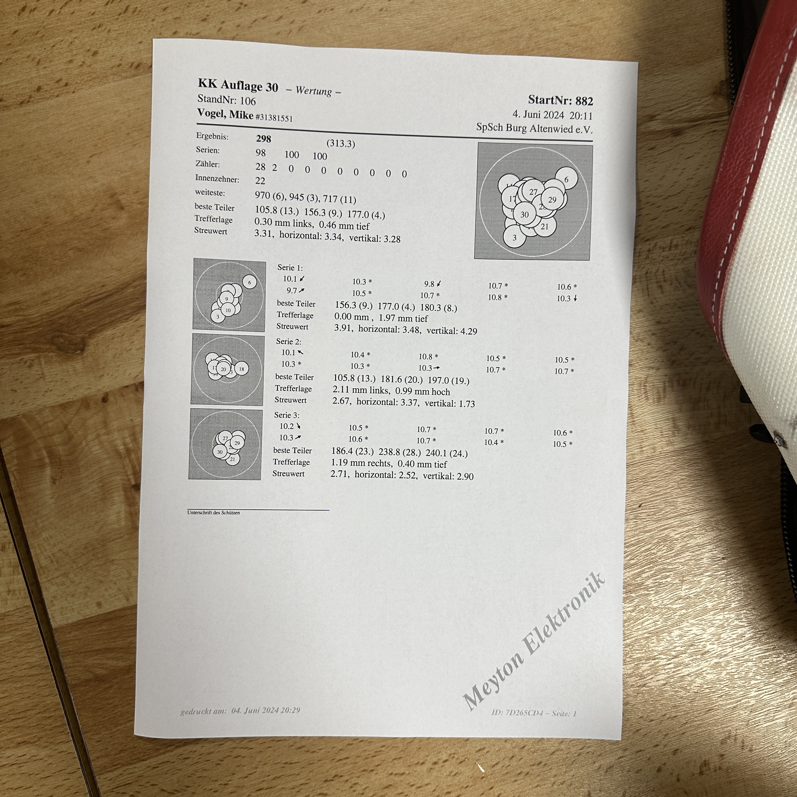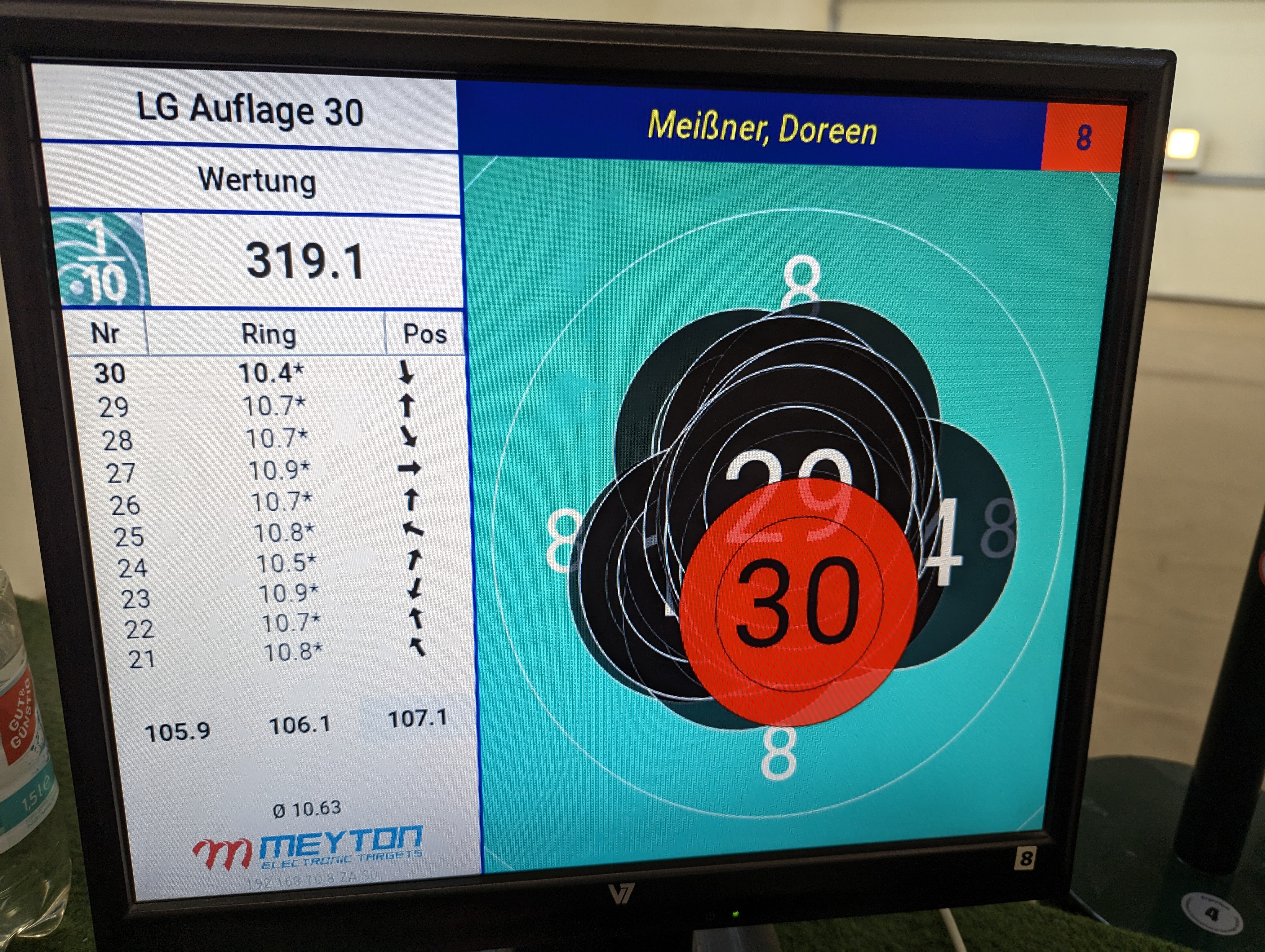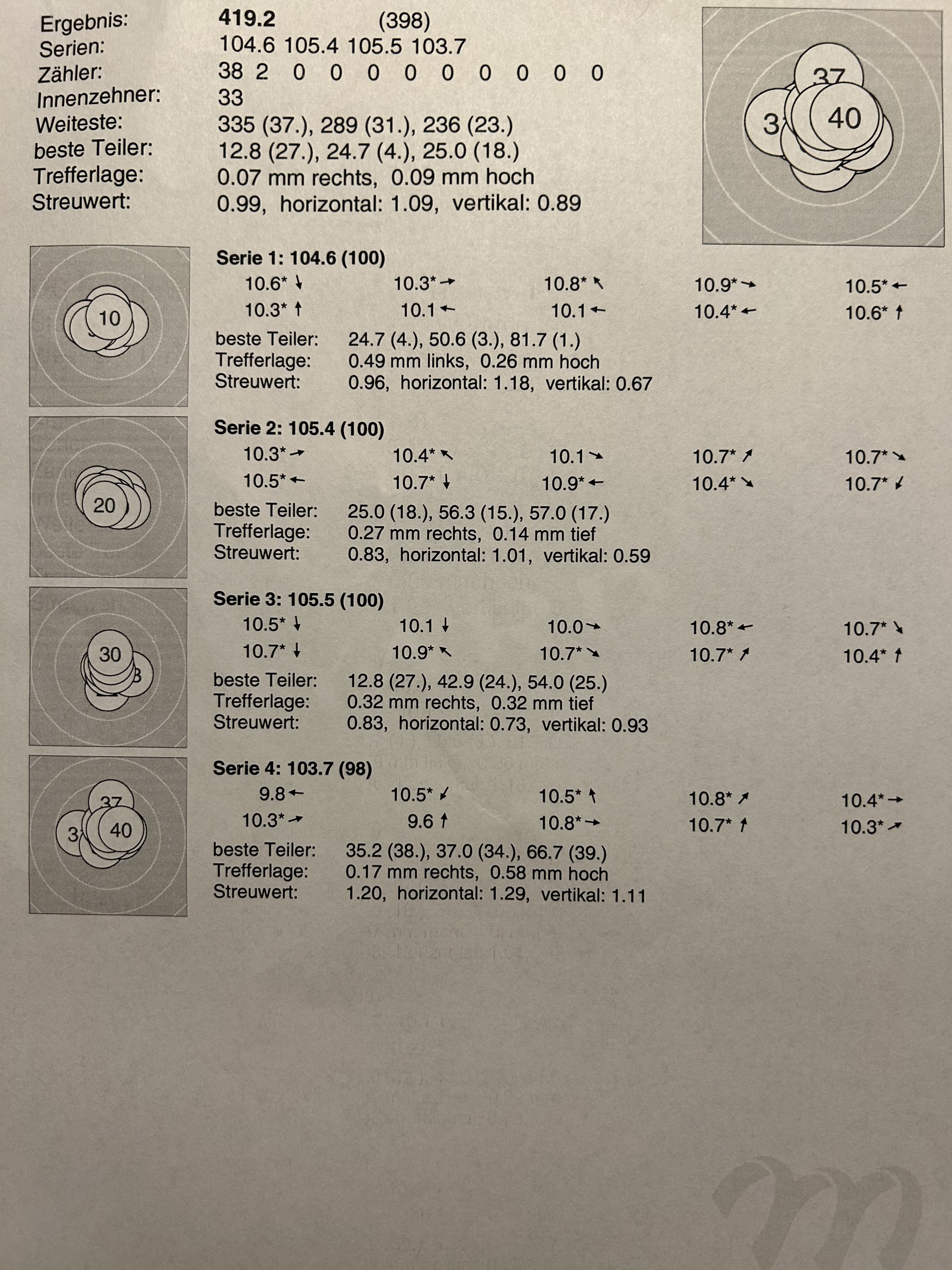 321,3 Ringe LG-A. Der eine Neuner war nicht so gut, aber 108 bei 10 Schuss bekomm ich diesen Monat nicht mehr zusammen, zumal jetzt laufend Landesmeisterschaften sind.