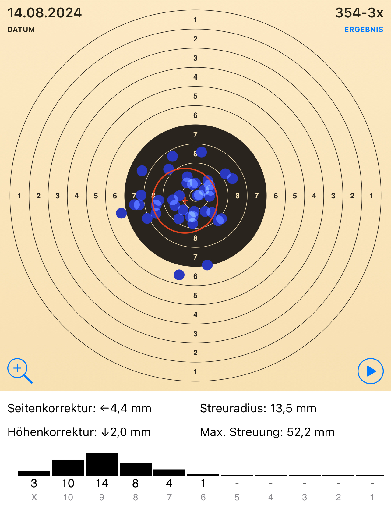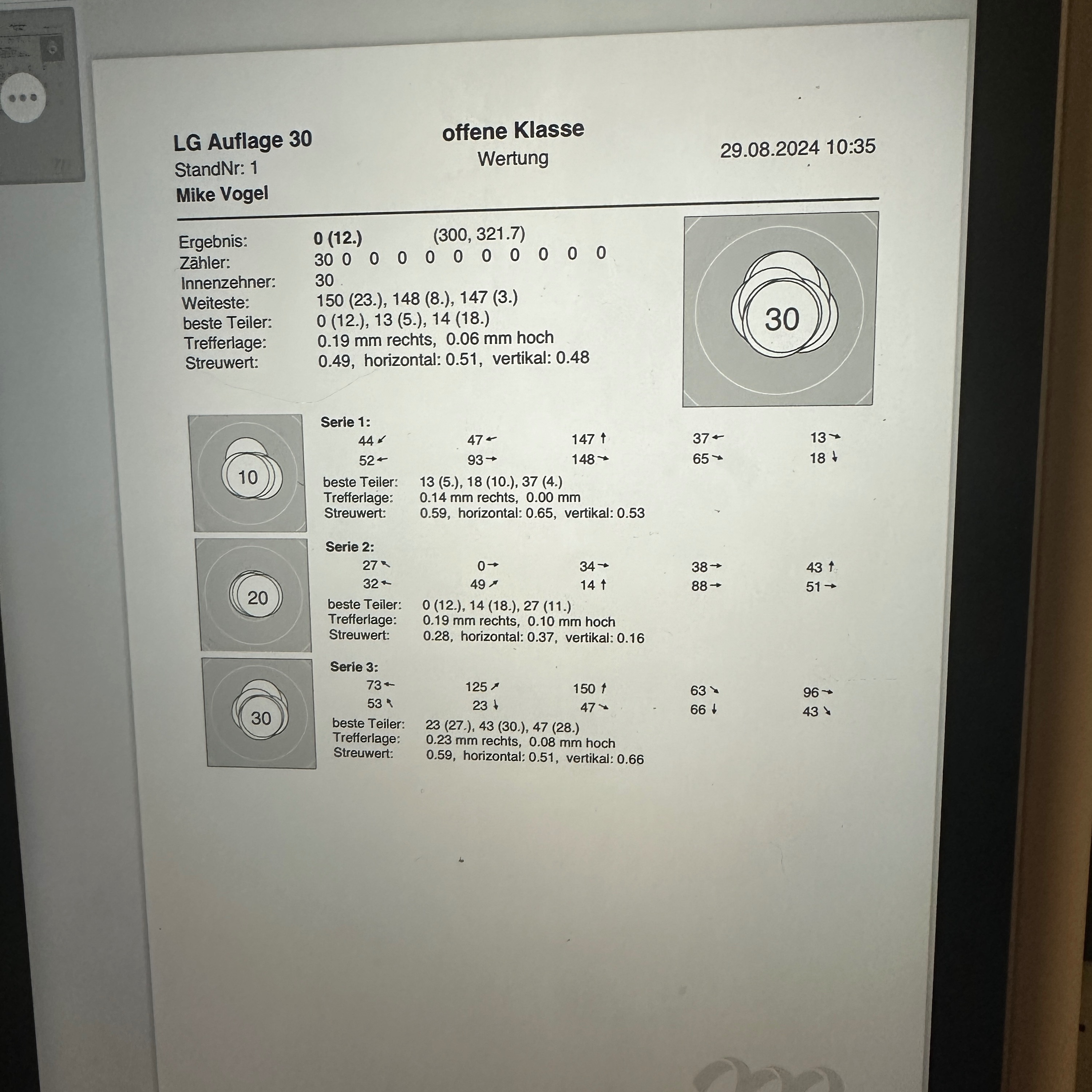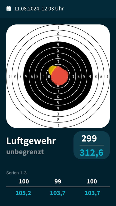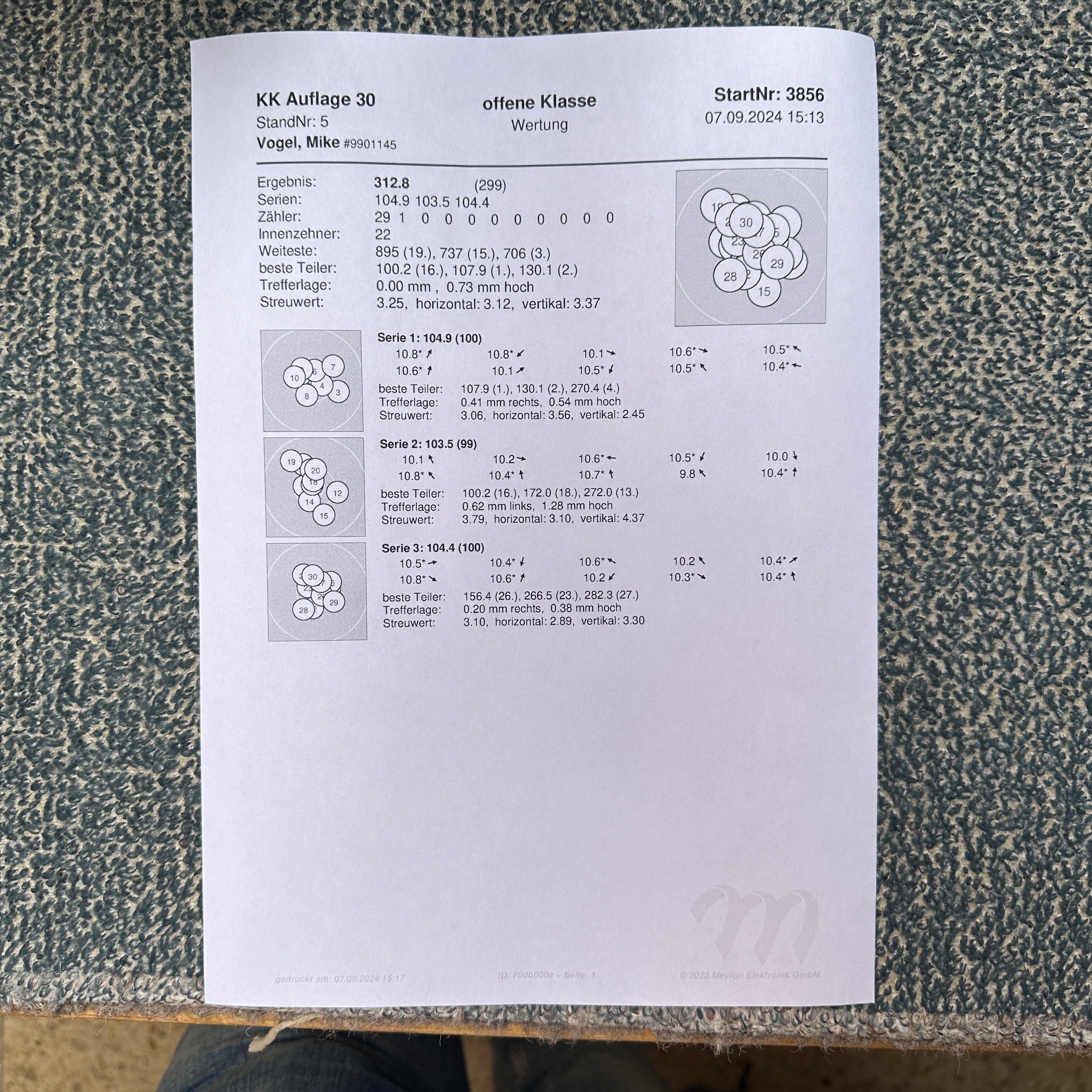 Meine Meldung KK-Auflage für August 2024: Ergebnis: 297 / 312,6 Ringe Inz. 20 / 9er: 3
