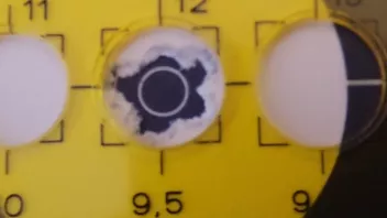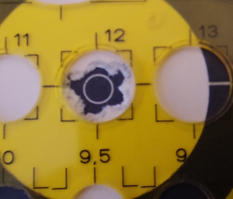 Es ist klar zu erkennen, das der 0-mm-Strich nicht am Rand des Einschussloch ist, sondern 1 mm im Schussloch. Man beachte das weiße und wenn ich es in der Vergrößerung betrachte, bin ich eher bei 16 mm Hinzu kommt, dass es nur 5 Schuß sind. Ein Schritt weiter, cal.22 ist im Durchmesser 5,6 mm. Bei 2 Schuss die sich berühren 11,2 mm. Hoch und tief sind 2 Schuss zu erkennen, und was ist mit dem Rest dazwischen? Auch wenn es aus der Schulter geschossen ist. Ein aussagekräftiges Schussbild bezieht sich immer auf mindestens 10 Schuss.