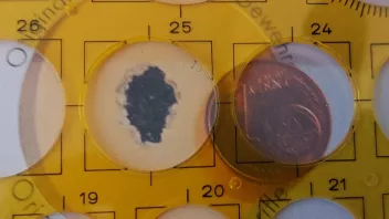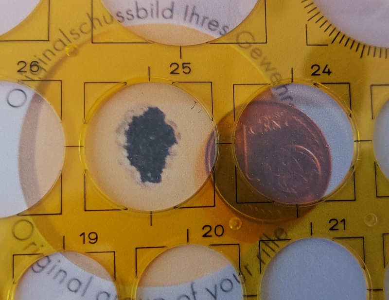 ich habe das Schussbild vom Anschütz-KK nur noch als Foto. Daher ist die Münze nur im Verhältnis zum Schussbild vergrößert.