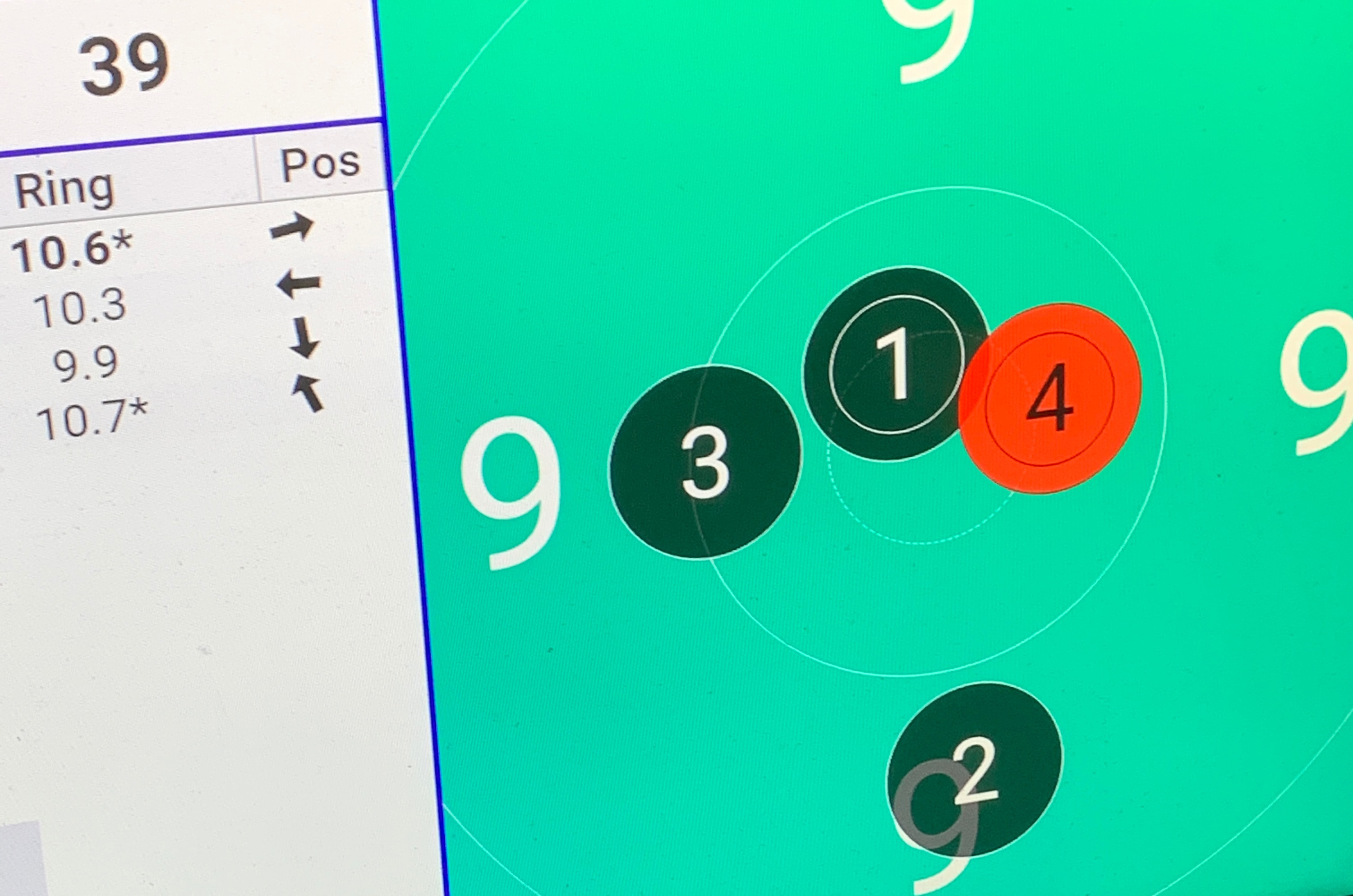 Nach einer kurzen Pause nach der ersten Serie hatte ich mich mal richtig unter Kontrolle und hab meinen Puls und Focus gut im Griff gehabt: 96 Ringe in der zweiten Serie! Es lief für kurze Zeit wie zu Hause. Ruhig, im Rhythmus und fokussiert. Dann ging der Kopf wieder an und es wurde schlechter.