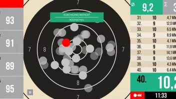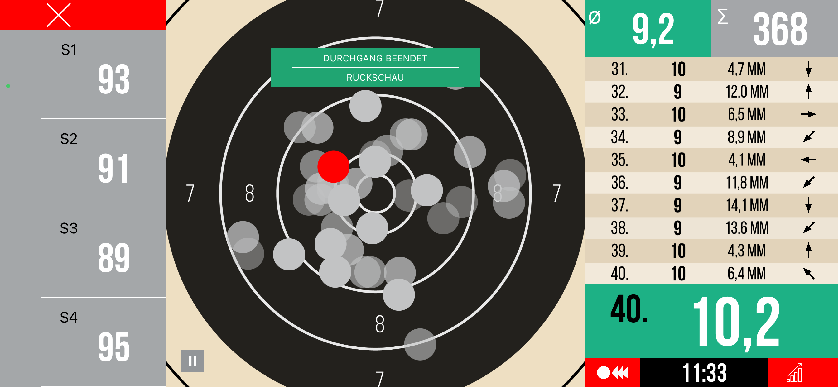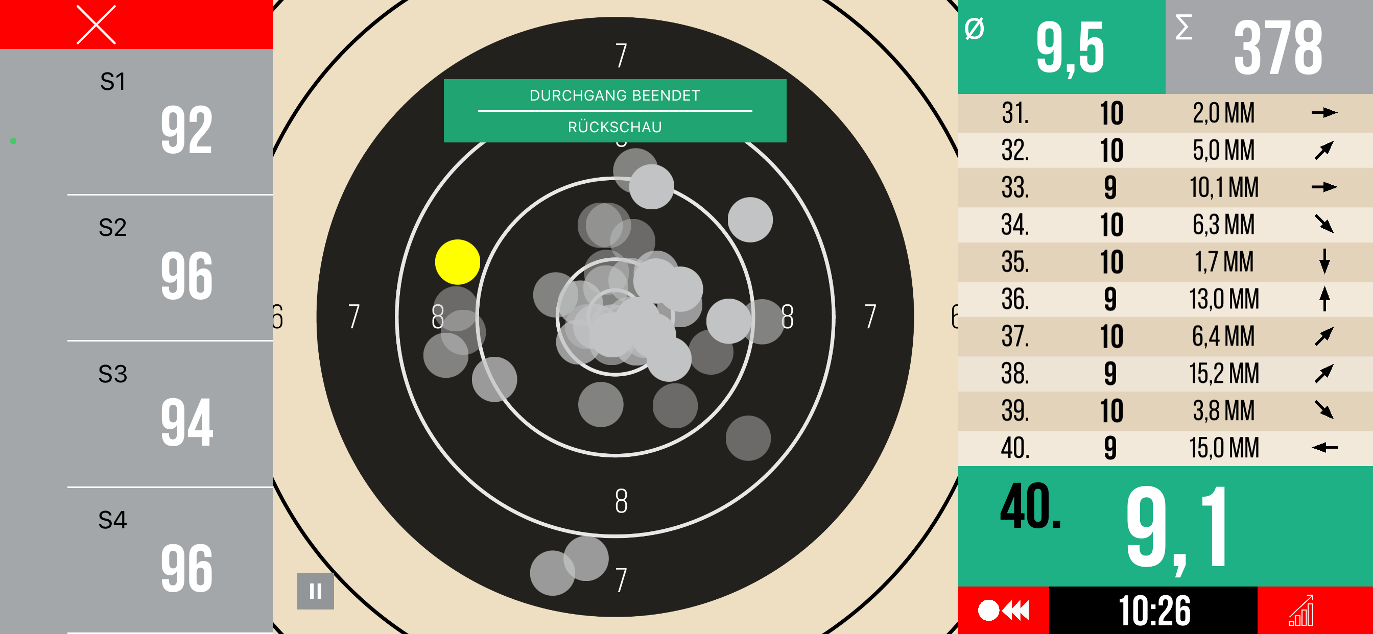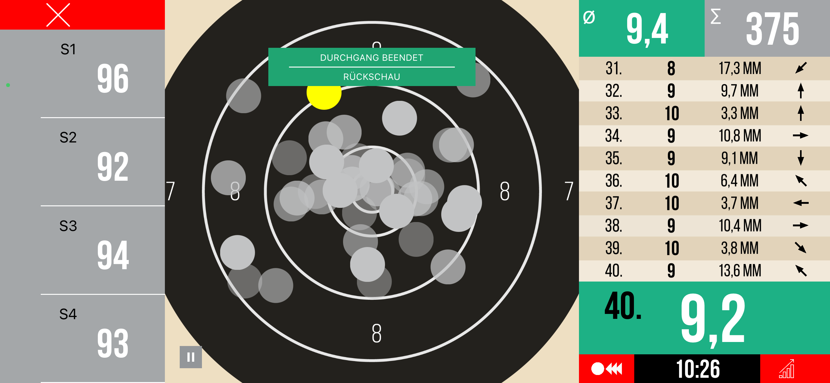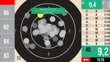 Und als hätte man mir ne Adrenalinspritze verabreicht, pumpt das Herz, rast der Kopf und zittert die Hand. Was im Training gestern noch selbstsicher gelang, war heute eine Zitterpartie mit teilweise heftigen Ausreißern (1x5, 1x6, 3x7). Diese Zitter-Ausreißer haben schon ordentlich Punkte gekostet.