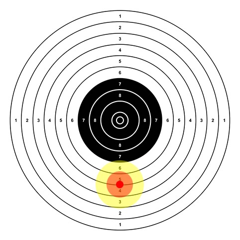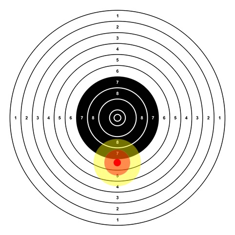 Und dann hab ich das mal mit mir selbst verglichen: Ich hab zwar sehr auf die Atmung geachtet, aber hab weder einen echten „ritualisierten Aufbau des äußeren Anschlages“ noch wirkliche Spannung im Oberkörper aufgebaut. Und wenn ich Ziele, dann achte ich zwar auf die Atmung, sacke aber eher sehr schnell und ungezielt von oben nach unten in den Halteraum und beginne dort erst das eigentliche Zielen. Da versuchte ich dann bisher das richtige Zielbild hinzubekommen und hatte eher mit zu tiefem Zielen zu kämpfen, das ich durch „heben“ (ja, falsch) zu kompensieren versucht habe.