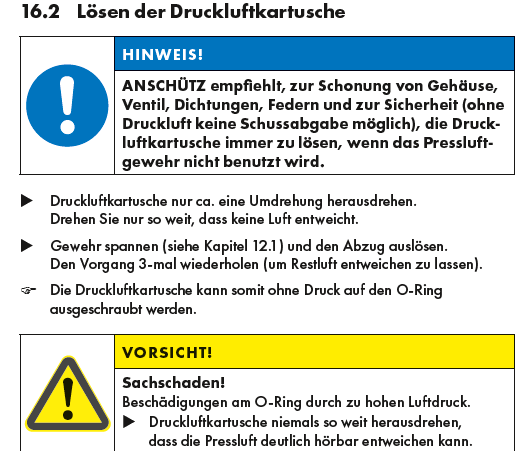 Ich schraub die Kartusche etwas los, dass kein neuer Druck aufgebaut werden kann, der vorhandene Druck aber noch nicht übers Gewinde rausgezischt ist, sie gelöst, aber nicht locker, im Gewinde sitzt. Dann schieße ich den vorhandenen Druck mit 2-3 Trockenschüssen aus dem Gewehr raus.