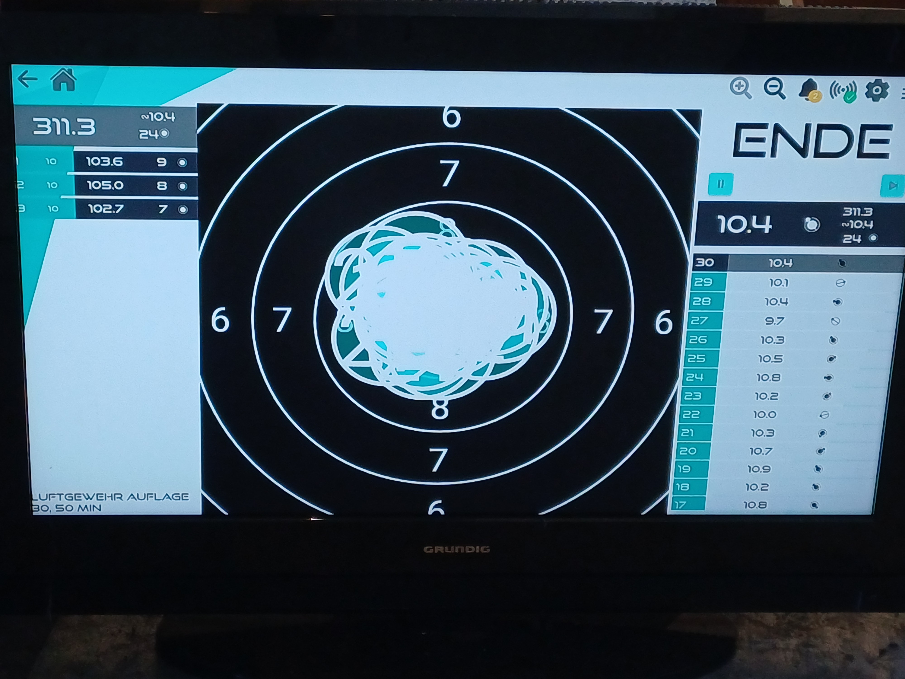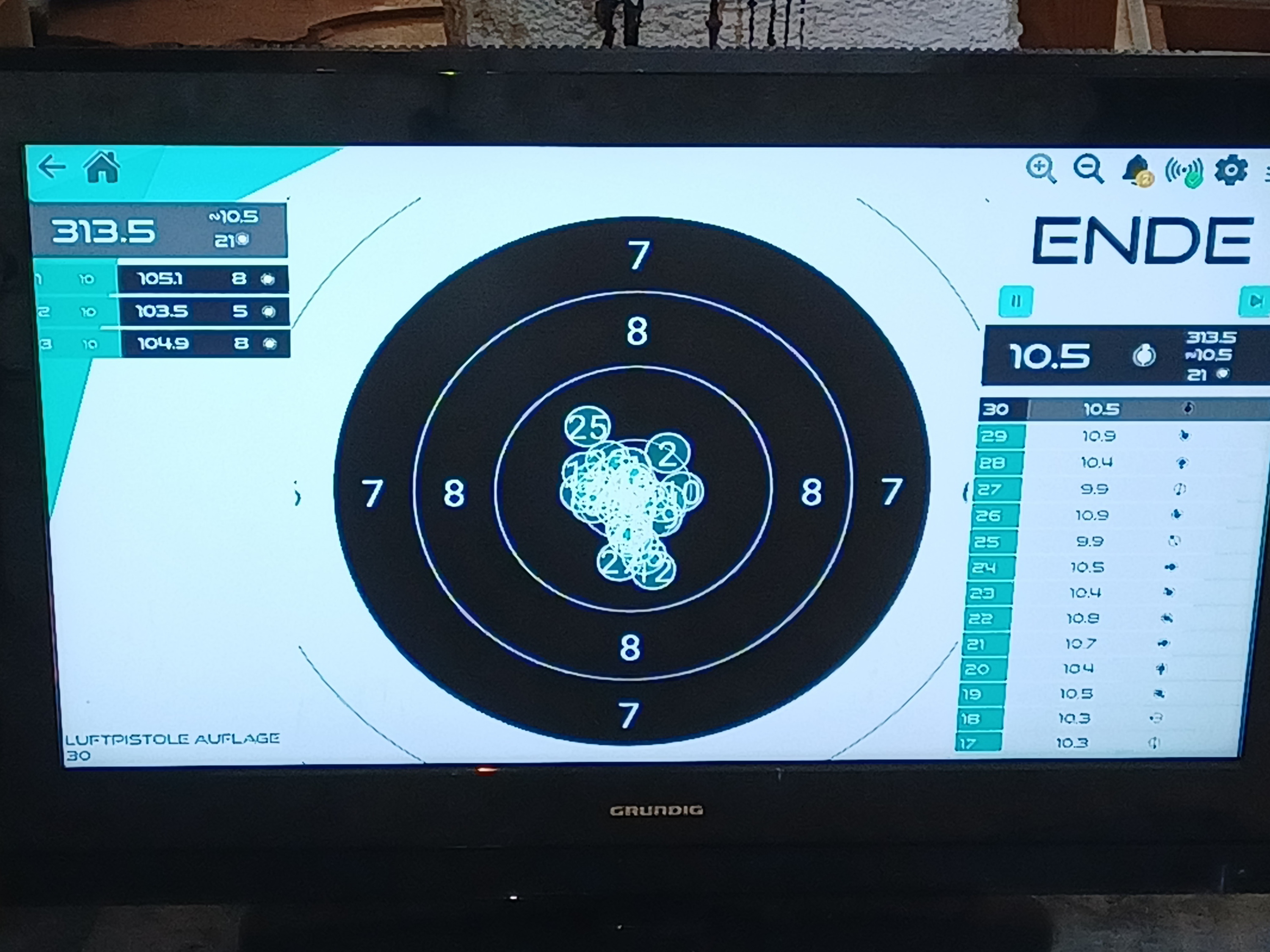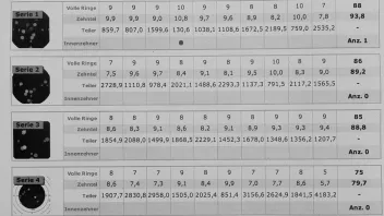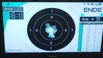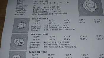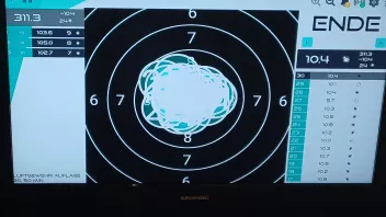 1.Serie 10,1 +10,3 # 2. Serie 10,4 +10,4 +10,4 # 3. Serie 3. Schuss 10,4 und der letzte in die 10.5 hoch, obwohl noch 15 Minuten auf der Uhr waren.