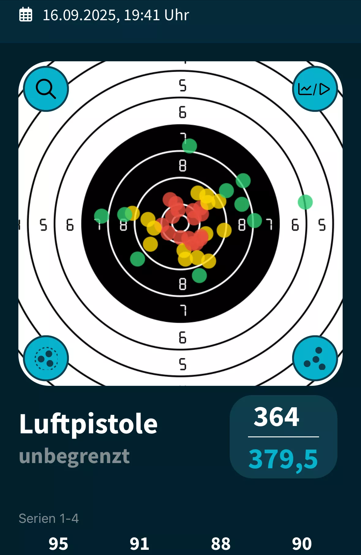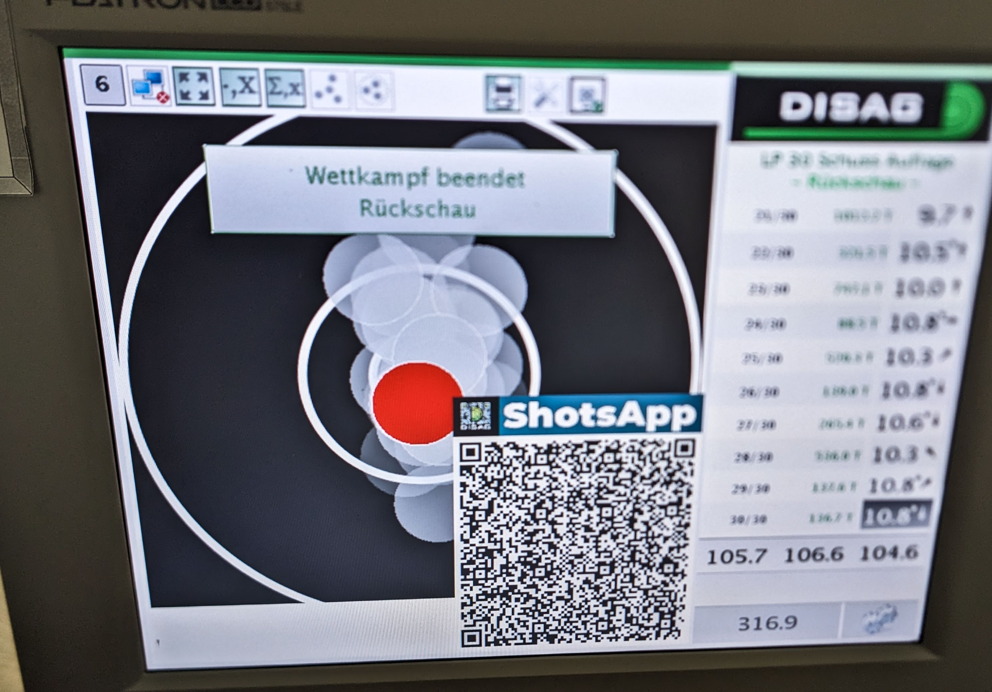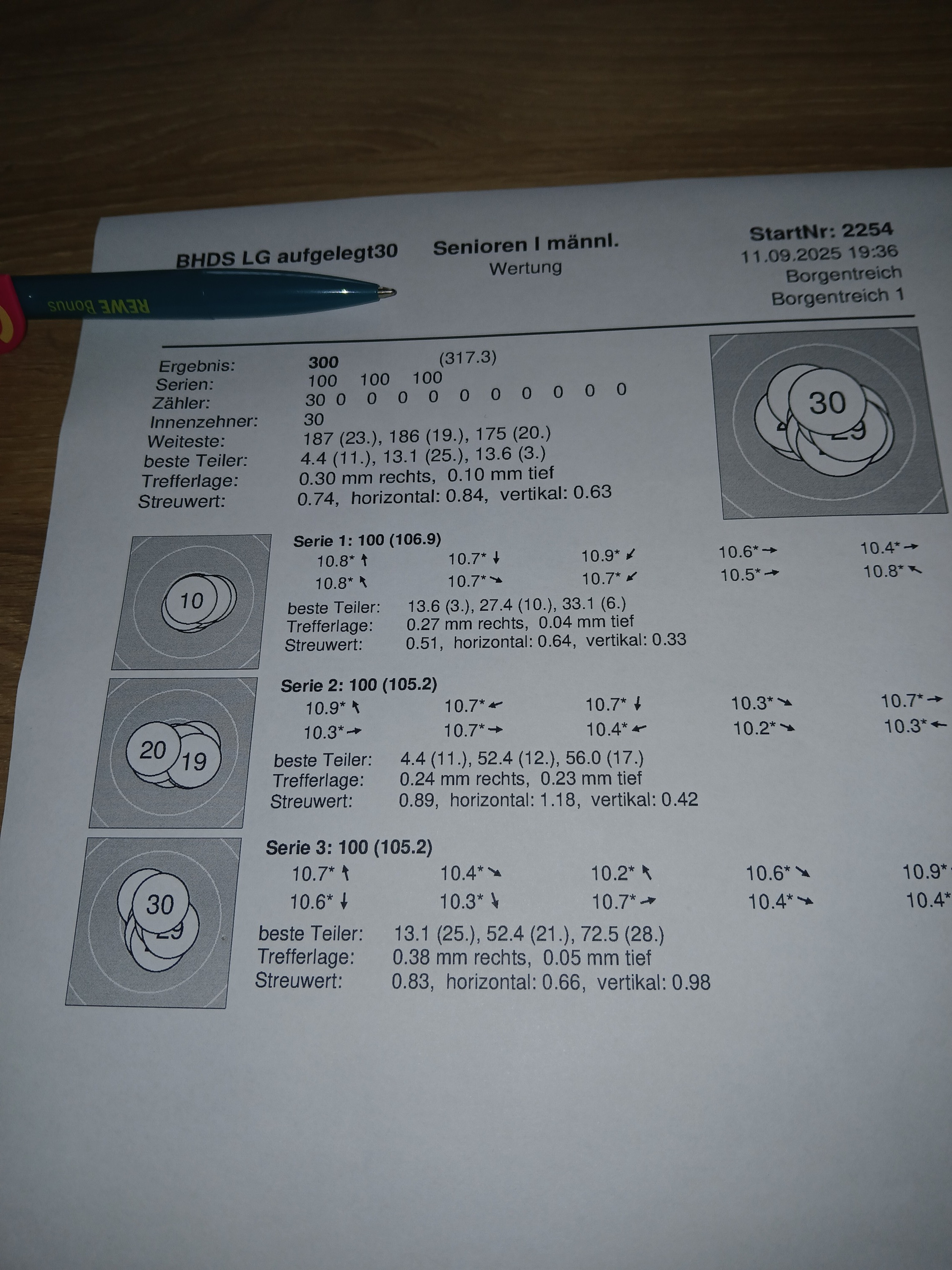 1.Serie 10,1 +10,3 # 2. Serie 10,4 +10,4 +10,4 # 3. Serie 3. Schuss 10,4 und der letzte in die 10.5 hoch, obwohl noch 15 Minuten auf der Uhr waren.