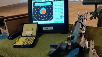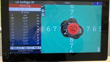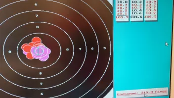 Zuganlage, Hilfe beim Wechsel nicht zugelassen. Jeweils nach 2 Schüssen vom Hocker aufstehen und Spiegel wechseln. Scheibenhalter ein Albtraum. Träger ist eine Sperrholzplatte, naturbelassen. Darauf montiert ist eine Quadratische Halterung in Spiegelgröße, ebenfalls Holz, naturbelassen. Hier wird dann der Spiegel eingeschoben. Kontrolweis gleich "null". Da schon diverses Blei die Halterung durchschlagen hat, ist ein sauberes einführen nicht möglich. Der Spiegel sitzt nicht mittig. Kommando Start, eine Zeit zum Einrichten wurde nicht gegeben. Schießzeiteit 55 Minuten. Probe noch sehr gut mit 8 Zehnern zum Schluss, 1. Serie mit zwei neuner, danach ging es nicht mehr. Das Auge hat gestreikt und die Konzentration war nicht mehr gegeben.