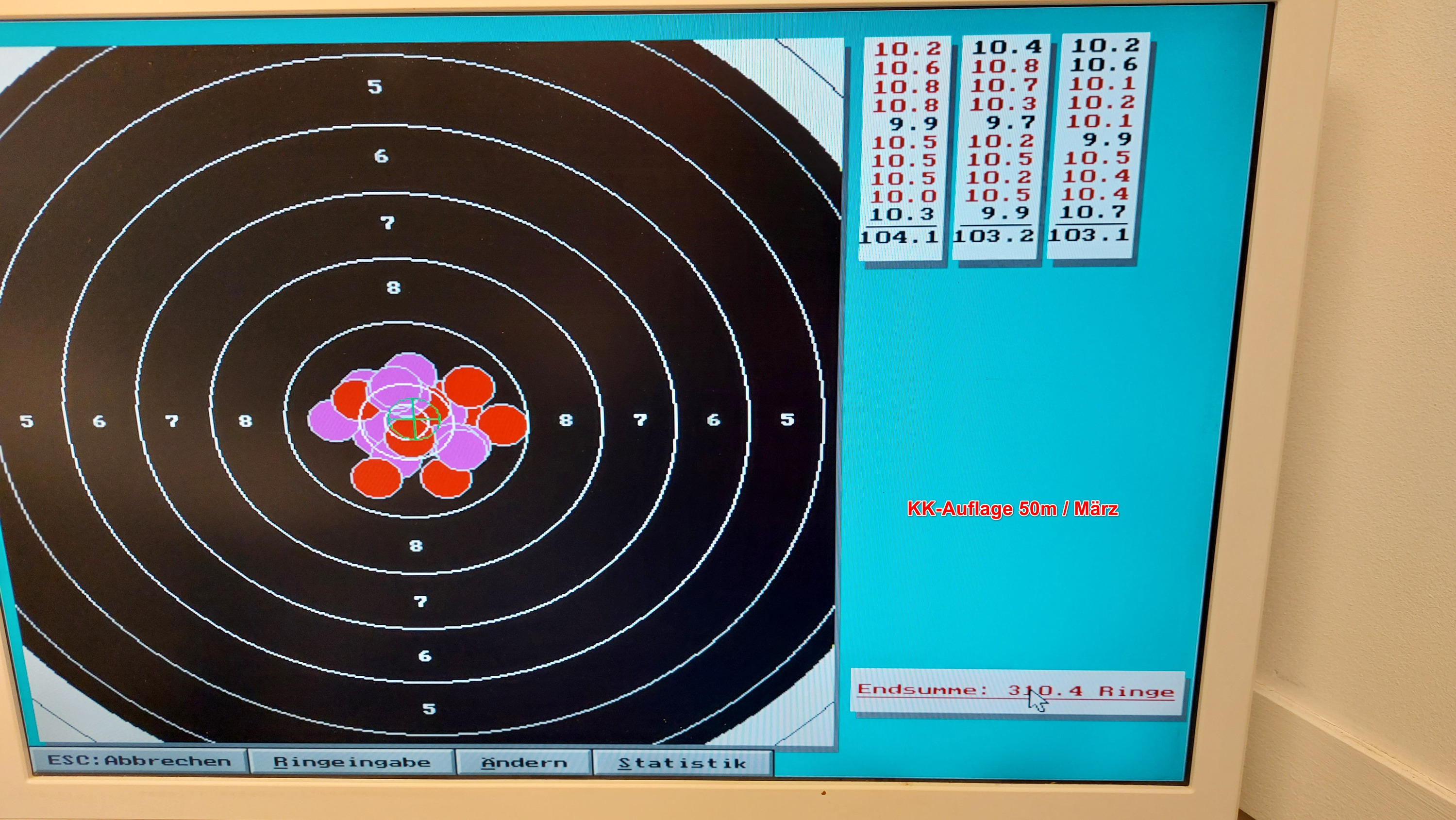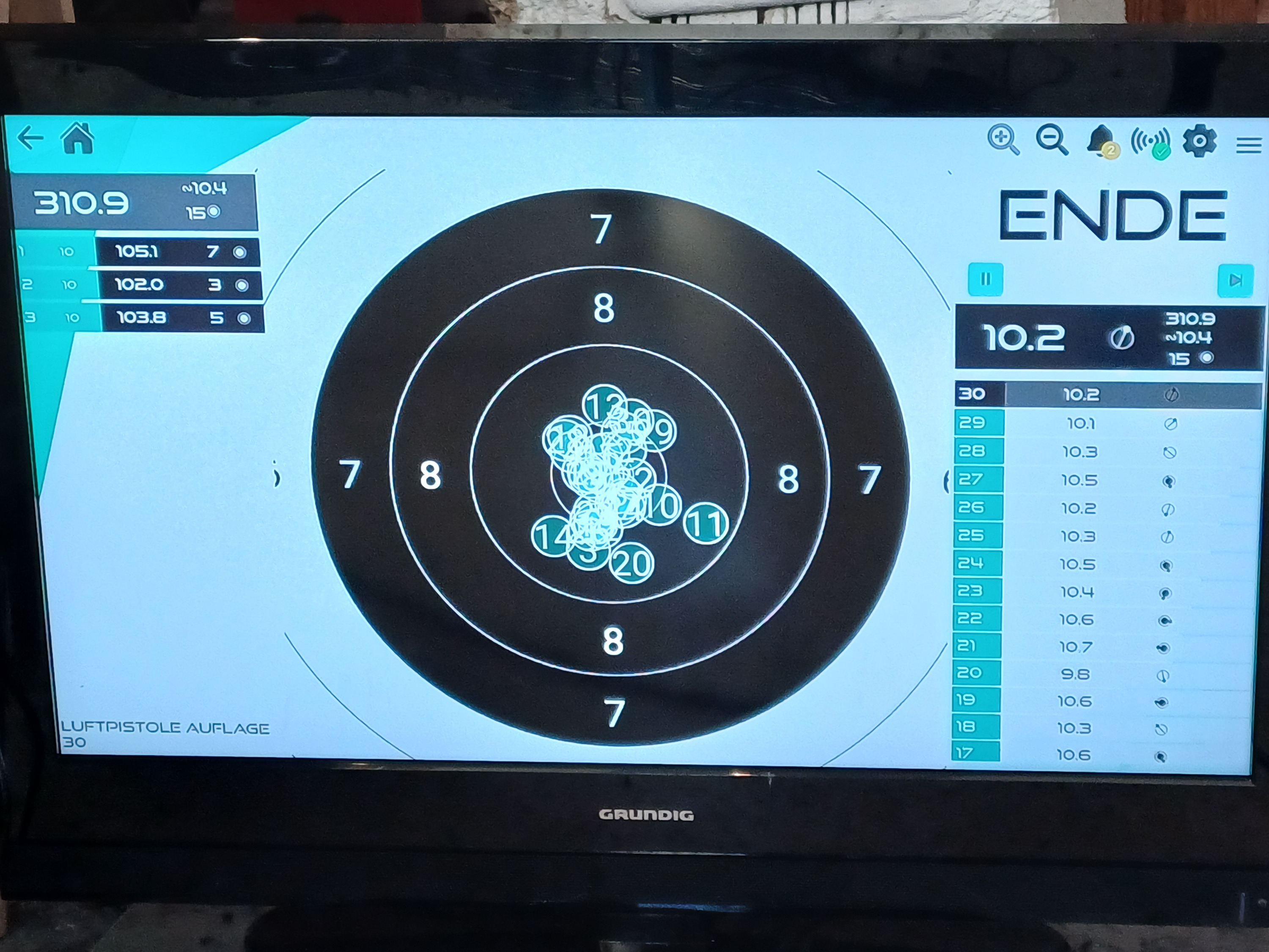 Luftpistole aufgelegt: 105,1 + 102,0 + 103,8 = 310,9