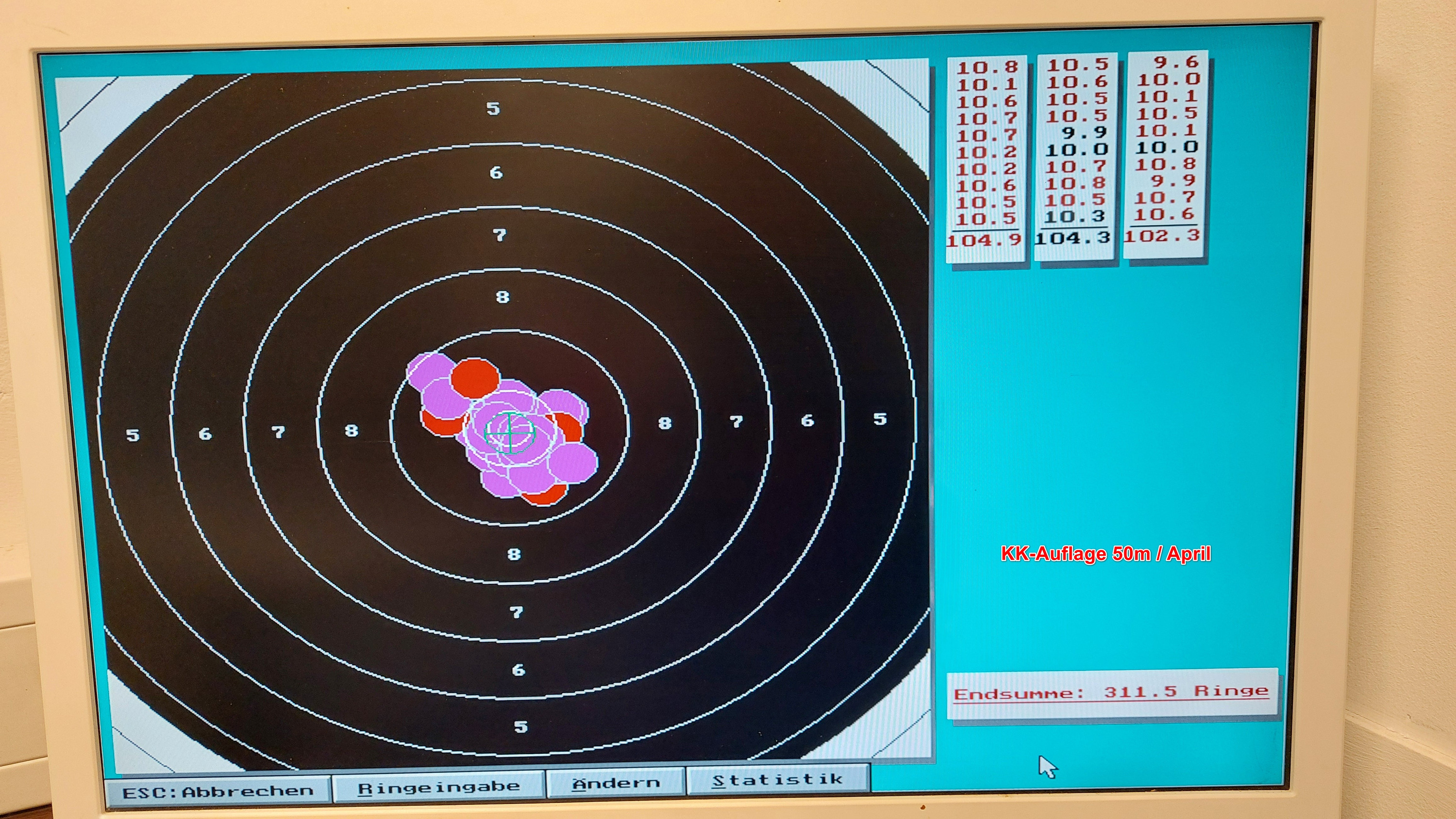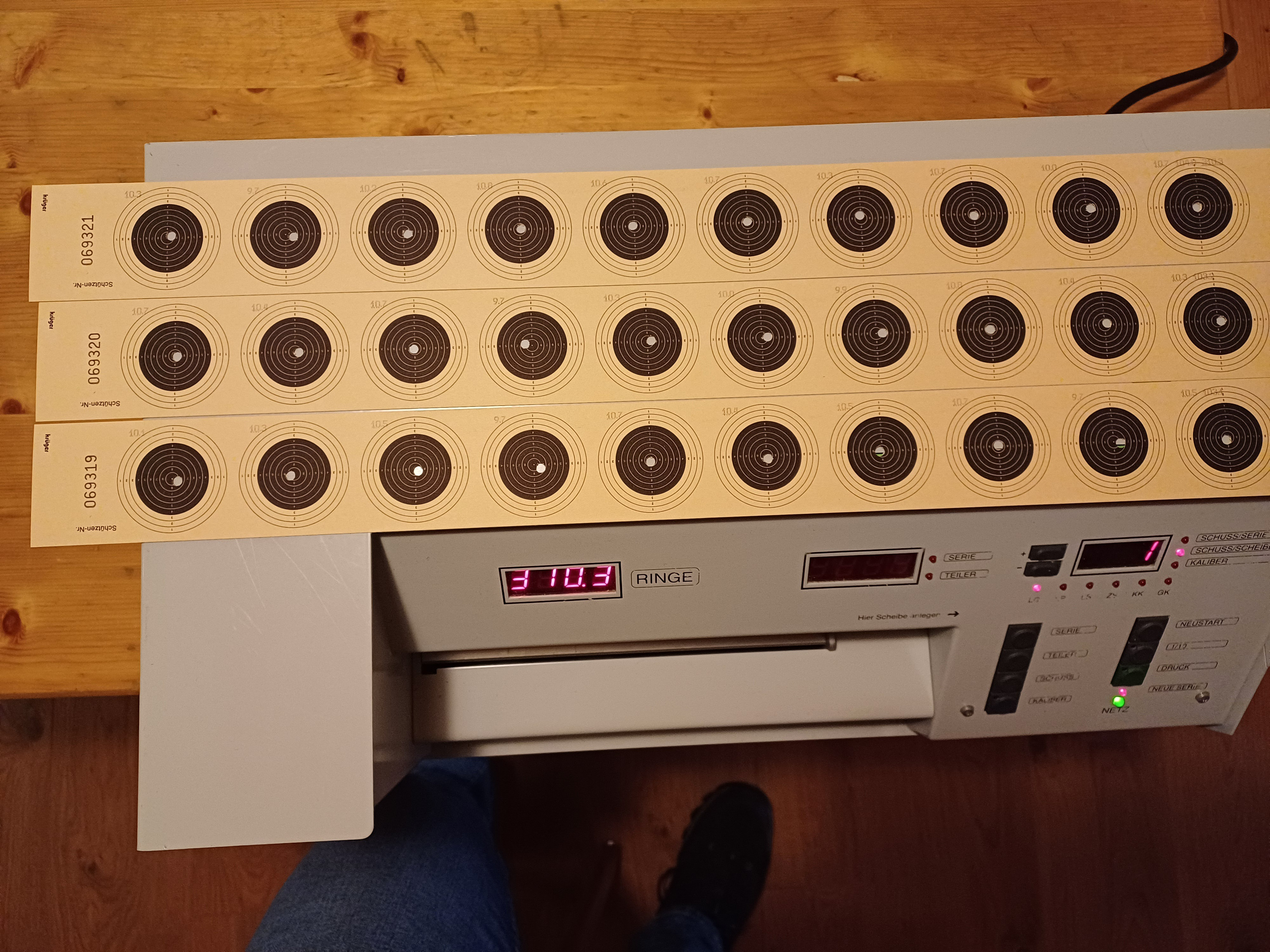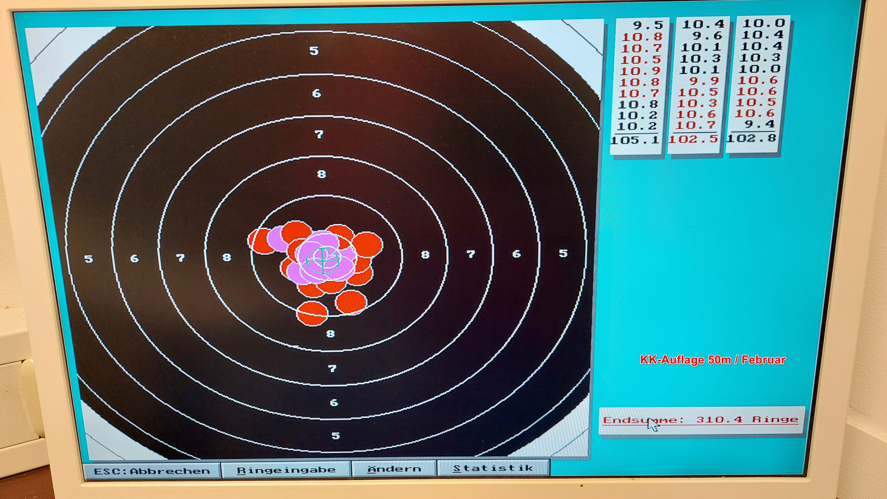 Erst gestern war es wieder so. Bezirksmeisterschaft KK 50m Auflage und ich durfte mal wieder auf einer Zuganlage schießen. Sitzend aufgelegt eine tolle Sache. Die Zuganlage benötigte gestoppte 40 Sekunden für hin und Rückfahrt. Plus die Zeit zum wechseln der Scheiben.Danach annähernd die Nullstellung finden, zielen und auslösen. Da nützt auch keine Zeitvorgabe . Diesen beschissenen Wettkampf habe ich dann mit vier 9er und zweimal 8 Ringe mit gesamt guten 306 Ringe beendet. Erfreulich waren die 5 Scheiben mit sehr hohen Zehnern, Loch in Loch. Das ist dann die Routine, mit der man sich aus dem Schlamassel holt.