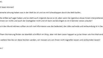 Auf meine Frage, weshalb sich der Bestellstatus über eine ganze Woche hinweg nicht verändert hatte und dann plötzlich der Hinweis erschien, dass der Artikel nicht auf Lager sei, erhielt ich lediglich eine patzige Reaktion. Mir wurde erklärt, es gebe allgemein Lieferprobleme. Als ich anmerkte, dass dies bei anderen Händlern offenbar nicht der Fall sei, wurde ich sofort scharf abgewiesen mit der Aussage, auf solche Hinweise wolle man gar nicht erst eingehen.