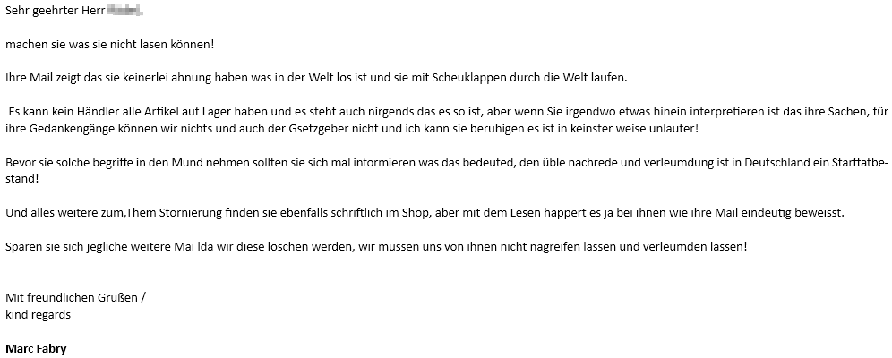 Ich teilte daraufhin mit, dass ich meine Bestellung stornieren möchte. Statt einer sachlichen Reaktion bekam ich nur den Hinweis, ich müsse dies schriftlich tun. Der Hörer wurde unmittelbar darauf aufgelegt. Es war wohlgemerkt mein erster Kontakt mit diesem Händler und die Art der Kommunikation war durchgehend unangemessen und respektlos.