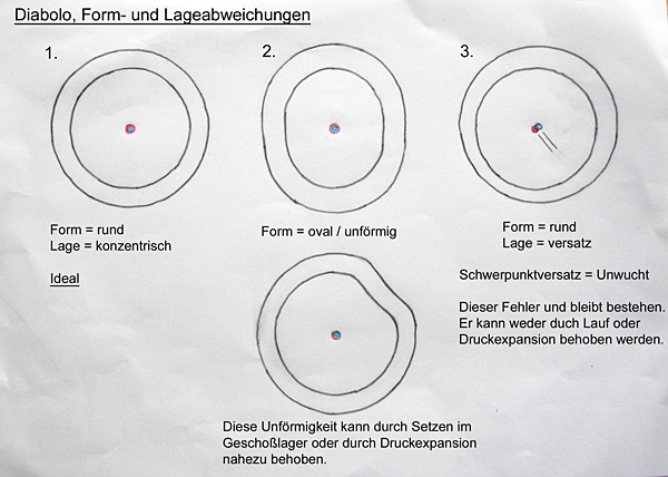 Form- und Lageabweichungen des Diabolos zu seiner Symmetrieachse (Unwuchten und Asymmetrien) wie z.B. exzentrische Kelche oder Kopfplatten kann ein Lauf nicht beheben. Diese bleiben von der Herstellung, auf dem Weg, bis zum Ziel Bestandteil des Diabolos. Der Lauf bleibt immer der gleiche, das Diabolos ist bei jedem Schuß ein anderes. Wo kommen dann wohl die Ausreißer her?