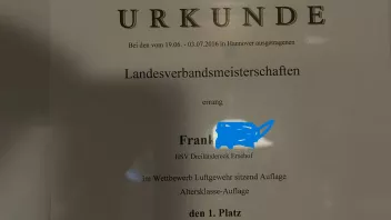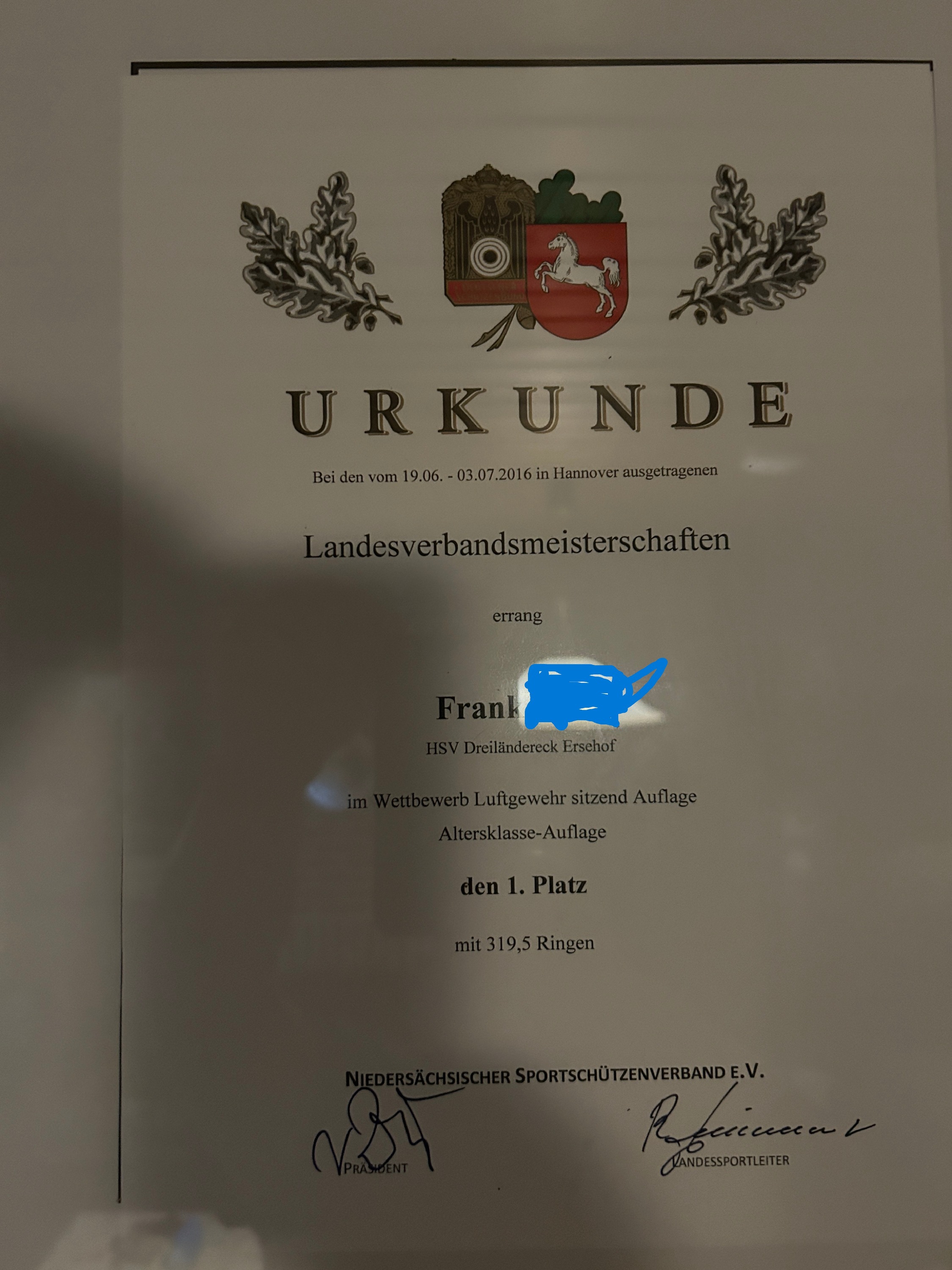 Ich habe 2014 mit 46 Jahren angefangen sitzend Auflage zu schießen( Davor stehend Freihand). Wir haben Rundenwettkämpfe geschossen und Kreis Meisterschaften. 2015 Bin ich bei der Landesmeisterschaft in Hannover gewesen und habe glaube ich den 4ten Platz gemacht. 2016 bin ich dann Landesmeister geworden. Wir haben immer mit 30 Schuss geschossen. Bei den Runden Wettkämpfen und Landesmeisterschaften. 327 ist das höchste in der 10tel Wertung gewesen. Siehe Foto