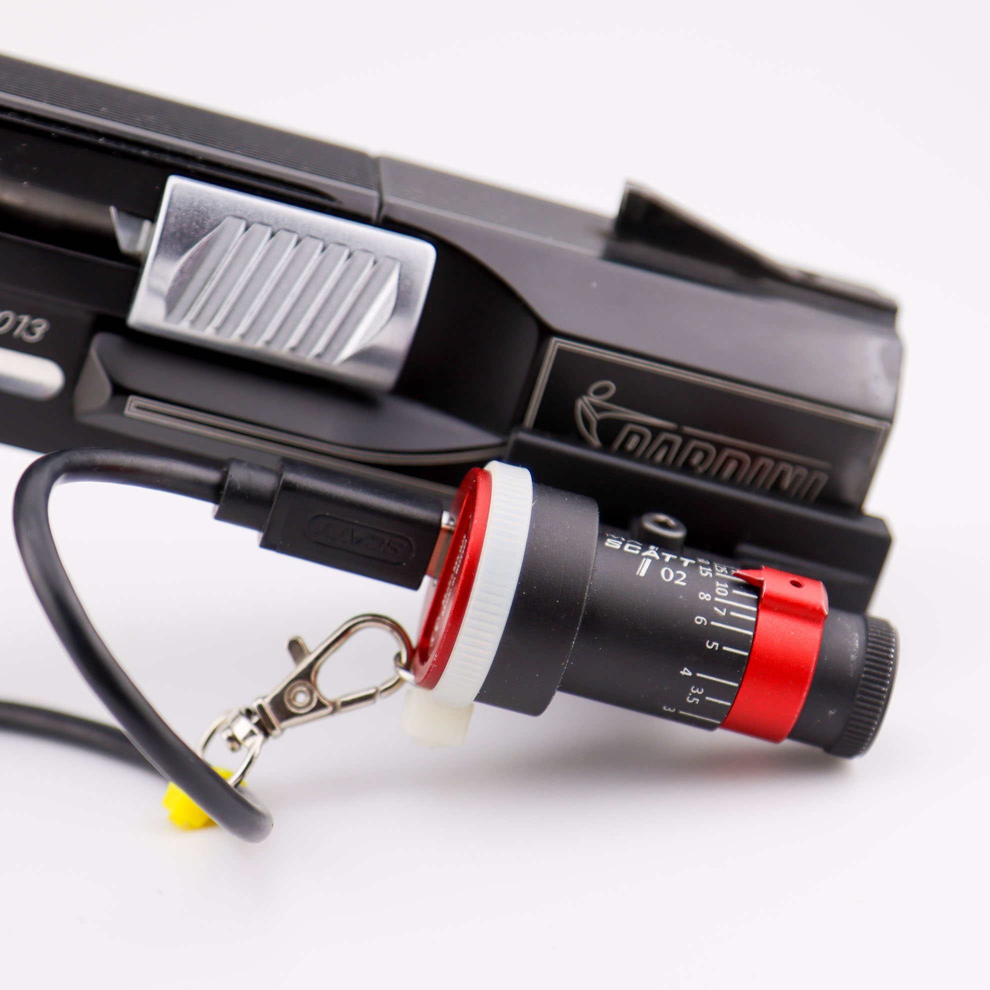 Meine ersten Modelle hatten die Scattaufnahme noch unten drunter. Das funktioniert zwar, hat sich aber in Handhabung durch die Sportler nicht optimal bewährt. Daher jetzt die Aufnahme auf der rechten Seite. Die Waffe kann trotz des montierten Scatt-Systems aufgesetzt werden.