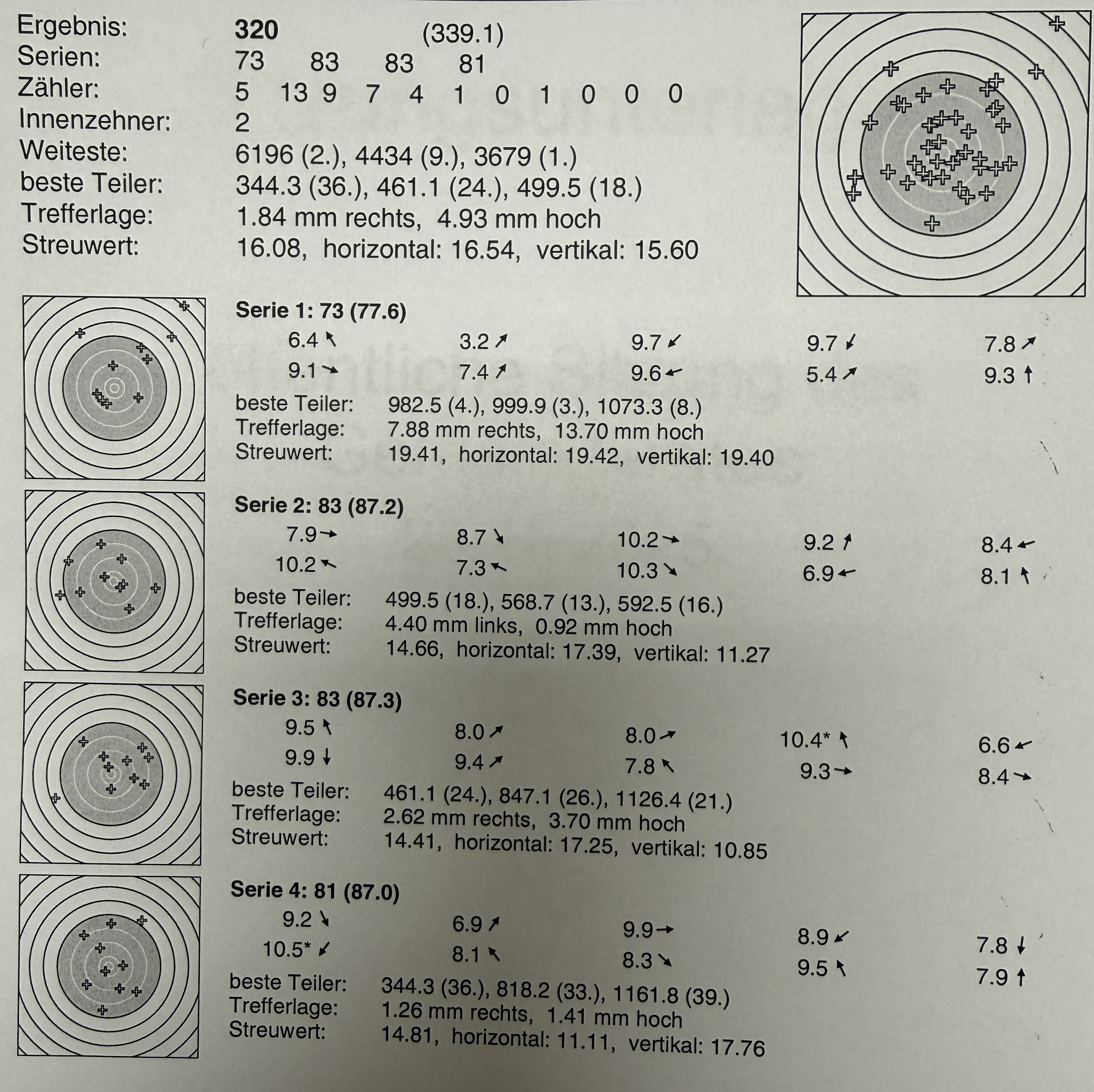 Die letzten beide Wettkämpfe schloss ich mit 325 ab, während mein Trainingsschritt am gewohnten Schiesstand bei 338 liegt. Personal Best bei 345.