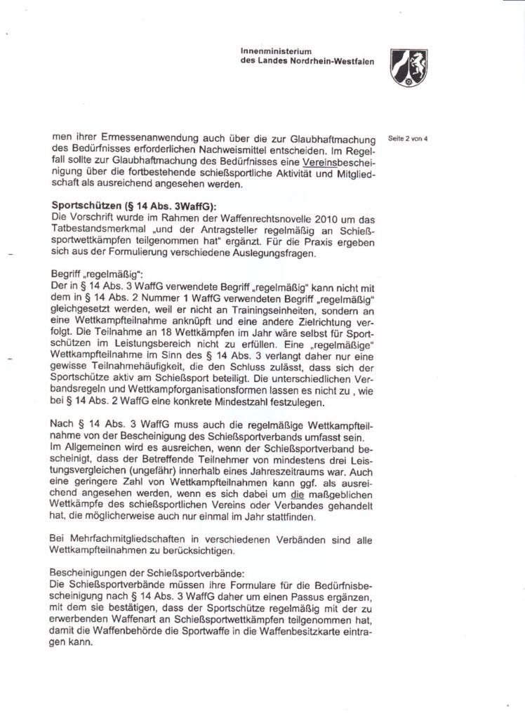 §15 (1) 7b fordert, dass die Vereine einen Nachweis über die Häufigkeit der schießsportlichen Aktivitäten jedes ihrer Mitglieder während der ersten drei Jahre, nachdem diesem erstmalig eine Waffenbesitzkarte als Sportschütze erteilt wurde, führen müssen. Daher reicht auch eine Bescheinigung des Vereins über den Fortbestand des Bedürfnisses aus.