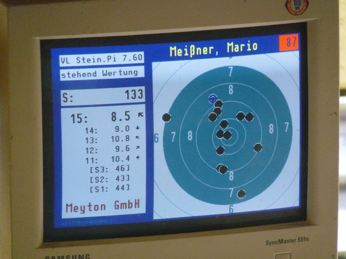 Da war mehr drin, denn die Serie 1 mit 48, Serie 2 mit 46 und die Serie 3 mit 38 Ringen nach 4 Schuß liesen mehr erwarten. Leider war der letzte Schuß nur eine 6 und damit wurde die 3. Serie mit nur 44 Ringen abgeschlossen.