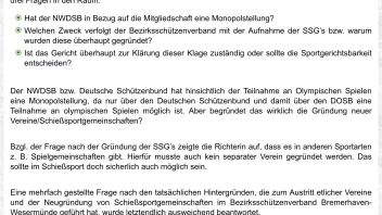 Der Richter hat mit sehr viel Geduld und von Beginn an mit dem Hinweis auf die negative Außenwirkung der Auseinandersetzung für eine gütliche Lösung plädiert. Er stellte fest, dass der NWDSB eine Monopolstellung hat, wenn es darum geht, Schießsporttreibenden deren Sport in einem geordneten Meisterschaftssystem zu ermöglichen. Festgestellt wurde vom Gericht auch, dass gerade der NWDSB mit Herrn Otten das Projekt Ziel im Visier und damit Mitgliedergewinnung betreibe, auf der anderen Seite Sportschützen/innen in neu gegründeten SSGn sanktioniert, die aus Vereinen kommen, die den Nwdsb/DSB verlassen haben.