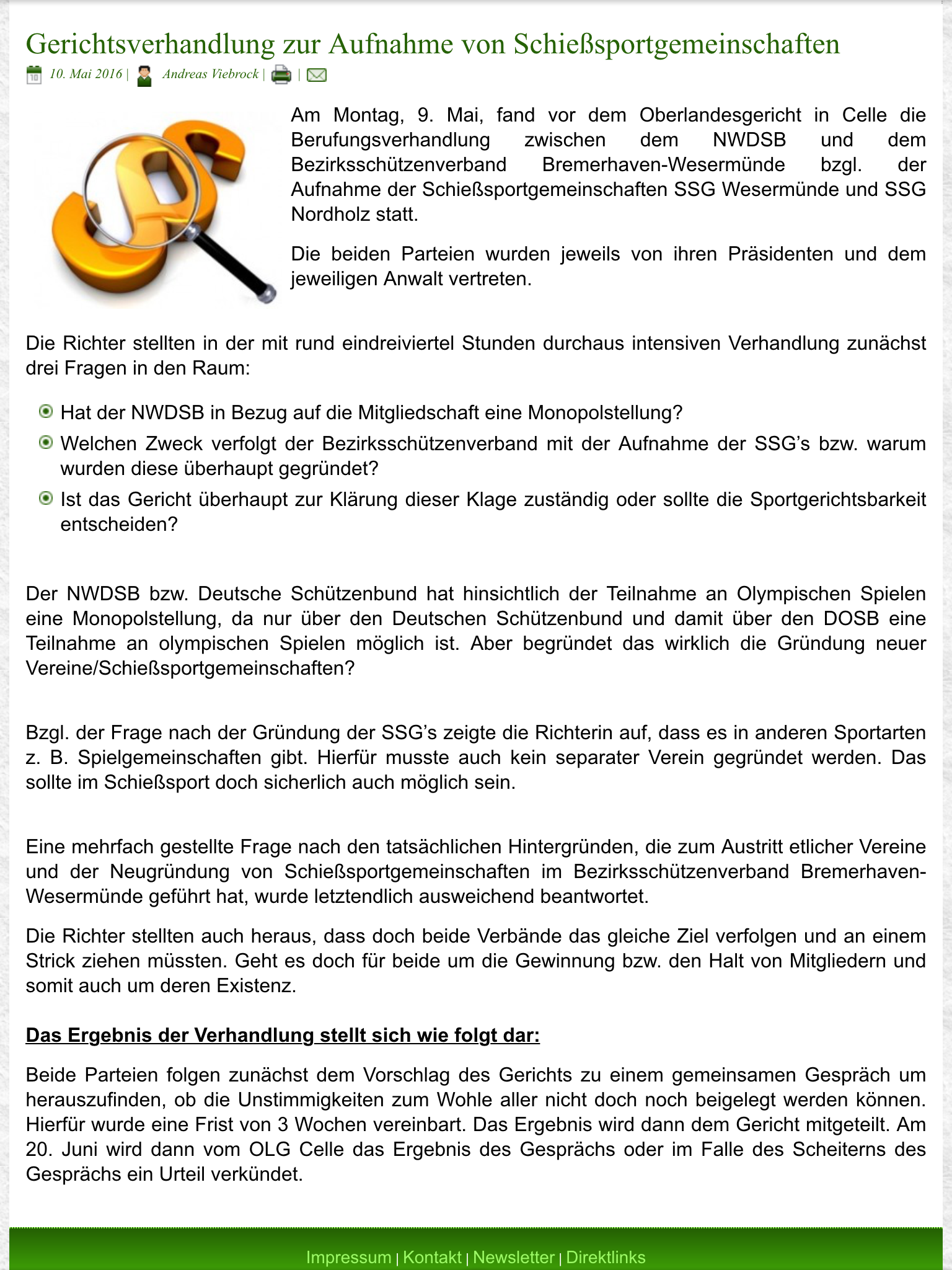 Wie ihnen sicherlich bekannt ist hat der Bezirksschützenverband Bremerhaven-Wesermünde gegen den NWDSB auf Aufnahme zweier neu gegründeter Schießsportgemeinschaften und die Ausstellung von Wettkampfpässen für die Mitglieder dieser Vereine geklagt.