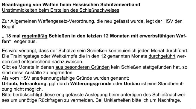 Für mich ist das unbegreiflich, wie ein Verband in dieser Form die gesetzlichen Regelungen, die in den Verwaltungsvorschriften zum Waffenrecht so auch nicht drin stehen. Der HSV hat zwar Gründe für fehlende Trainings angegeben, schreibt aber vor, mindestens 18 mal im Jahr traineiren zu müssen. Diese 18 mal müssen auf alle 12 Monate verteilt sein. Also es wird tatsächlich erwartet, jeden Monat auf dem Stand zu sein.