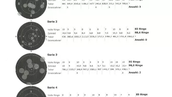 Nach 2. Programm kleine Veränderungen durchgeführt. Diopter 1 cm näher zum Auge, Schaftkappe etwas mehr nach unten geneigt. Dadurch anschlagbedingt Auflage etwas erhöht. Ringkorn um 1/10tel aufgedreht. Durch die Veränderungen Trefferbild 9 hoch.