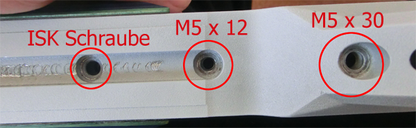Ergänzung: Die ISK-Schraube sollte eine Senkkopf-Schraube sein, damit sie nicht in die Schiene ragt. Länge dürfte gleich der zweiten sein, wenn die Senkung passt. Wichtig ist halt, dass sie nicht oben wieder aus dem Adapter raus kommt. Ich sehe gerade anhand der Zeichnung, für die beiden anderen Schrauben werden auch noch Tellerfedern benötigt. Am besten, Du besorgst Dir die Sachen gleich bei Walther.
