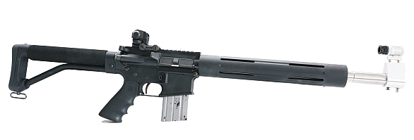 • KK-liegend, ja, das ist bei mir die Disziplin "Sportgewehr Selbstlader, Kleinkaliber, offene Visierung" im BDS. Es werden liegend freihändig dreißig Schuß gemacht, Entfernung 50 Meter. Mein Rekord sind 293 Ringe, Gesamtstreukreis (umschlossen) ohne einen Ausreißer bei 45mm, über die Hälfte der Schuß auf 20mm. Es war sehr heiß an diesem Tag, so schoß ich im T-Shirt, auch ohne Riemen. Abzugsgewicht etwa 2.000 Gramm. Bei dieser Disziplin dürfen 10 Patronen geladen werden, Schießzeit ist 10 Minuten pro 10er-Serie.