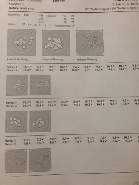 Hier nun die Infos: Geschossen auf dem Heimstand bei ca. 11 °C, alleine auf dem Stand. Eingeschossene Munition Rifle Match S. Zeitbedarf ca. 100 Min. inkl. 15 Min. Probe.