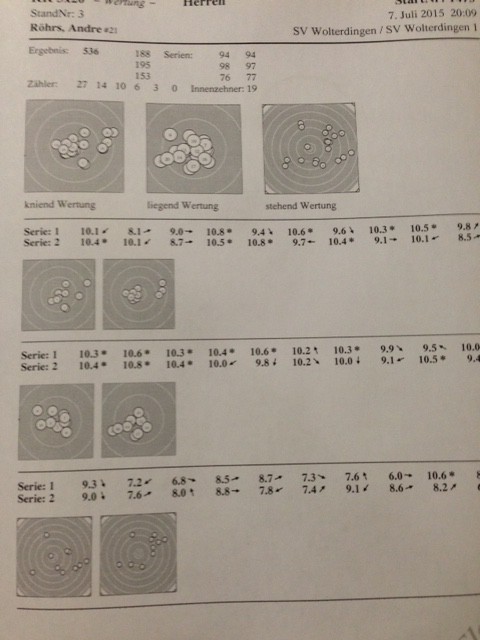 Das Ergebnis sagt mal wieder alles, ich komme im Stehendanschlag einfach nicht zu recht. Dieser Anschlag verhagelt mir regelmäßig meine Vorarbeit im Kniend und Liegend. Ratlos...