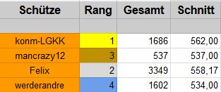 Wenn das deine einizigen sorgen sind- die Ergebnisse, die ich hier einreiche schieße ich im Training locker, muss mir keinen Kopf machen, dass es schlechter wird.... Schieße ich wettkampf kannst du mitunter 30-40 Ringe abziehen- ich habe jetzt das Techniktraining hintenangestellt und mit physischem Training begonnen deswegen- 15 min 3km joggen gehen und noch 15 min Gymnastik für Bauch und Beine, weil ich dort nachholbedarf habe... Letzter Wettkampf war dann wieder ganz ok....
